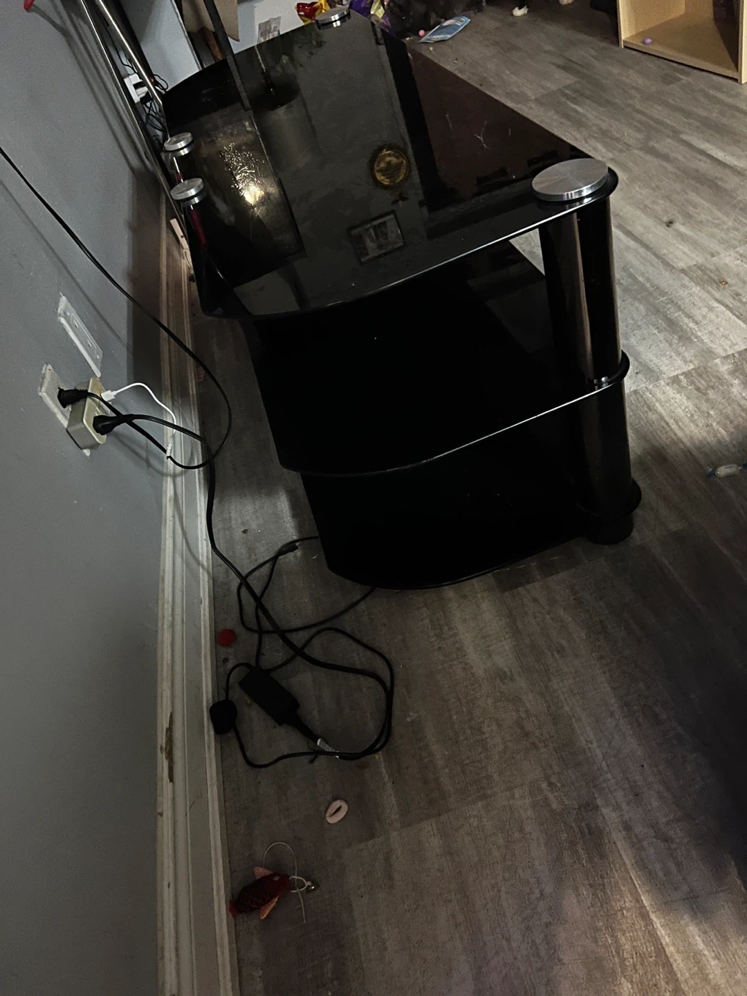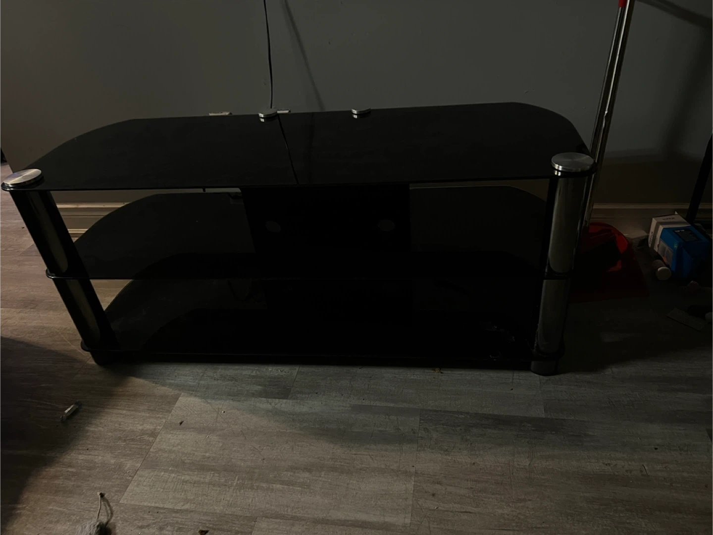 This is a three-tiered black glass TV stand with chrome accents. It's suitable for holding your TV and media devices. The tempered glass shelves offer ample storage space. It is in excellent condition! Very modern look. And super durable and strong!