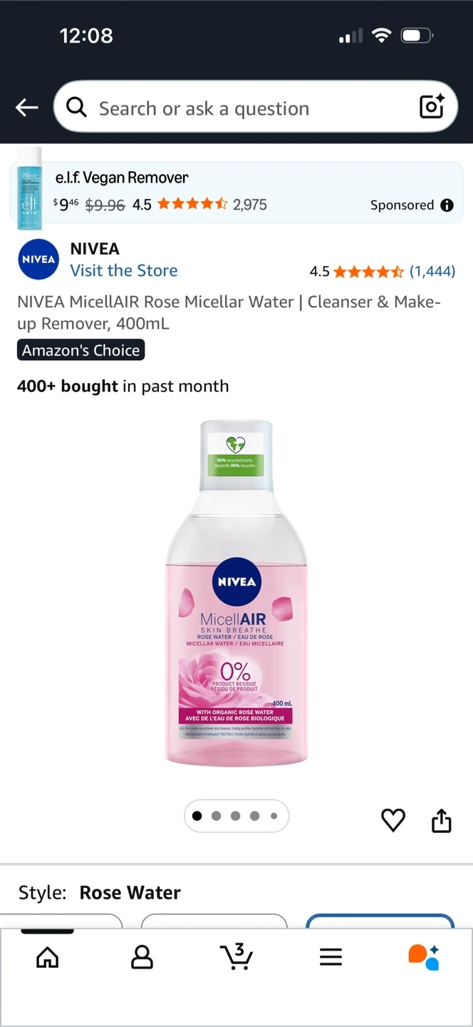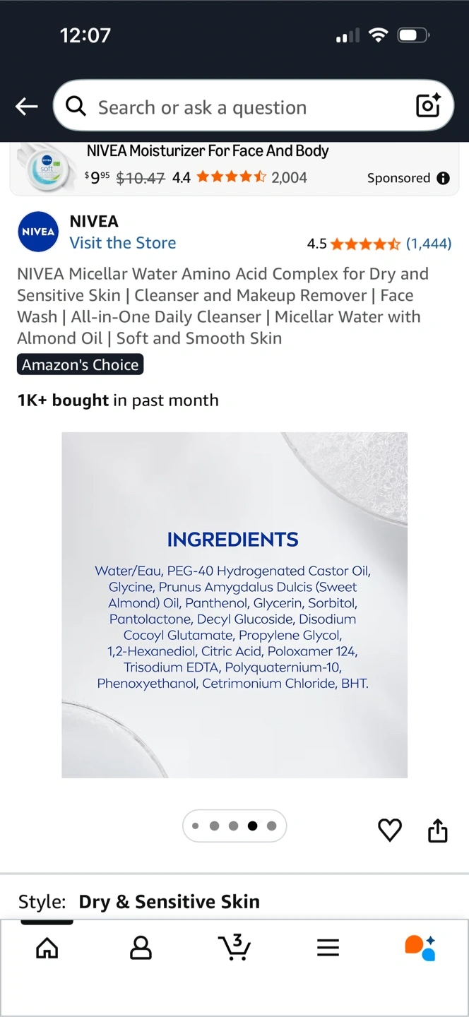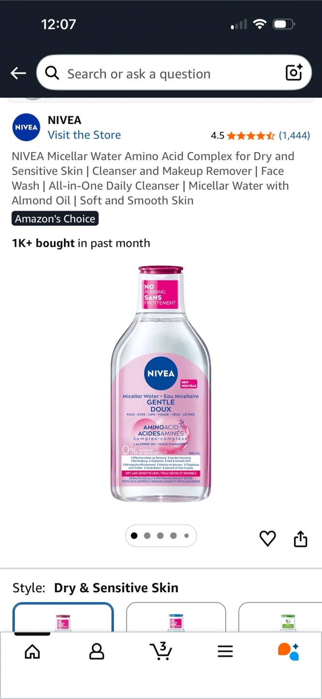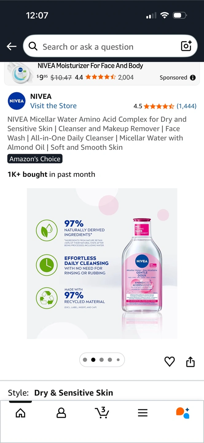 NIVEA Micellar Water for Dry & Sensitive Skin. It's an all-in-one daily cleanser and makeup remover. It's made with 97% naturally derived ingredients and 95% recycled material. Suitable for face, eyes, and lips.