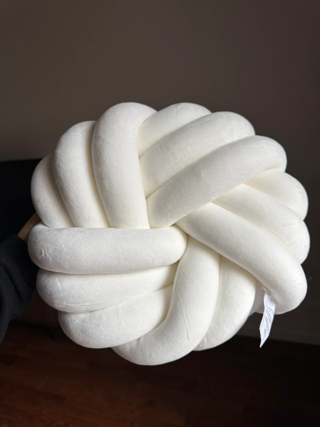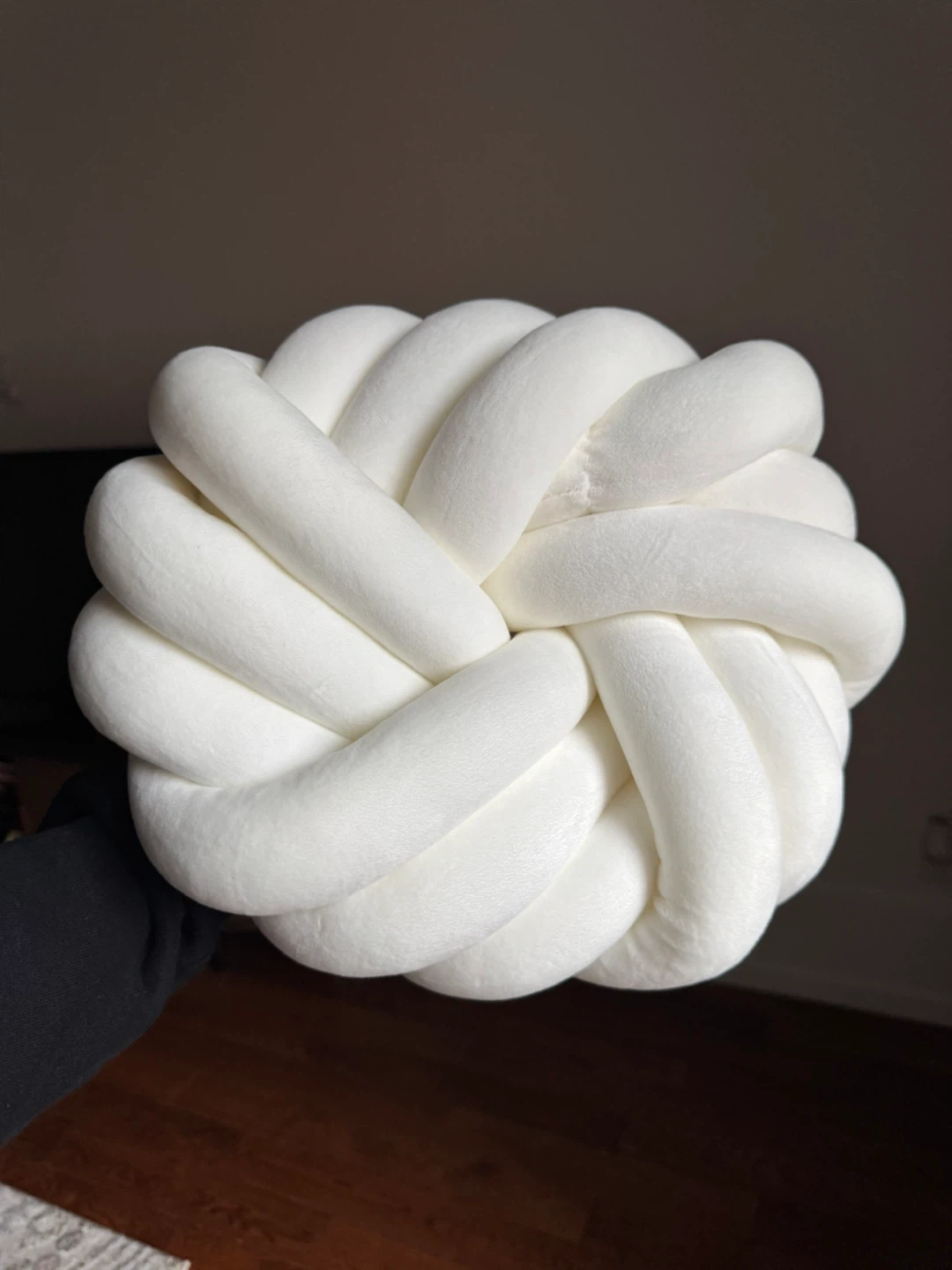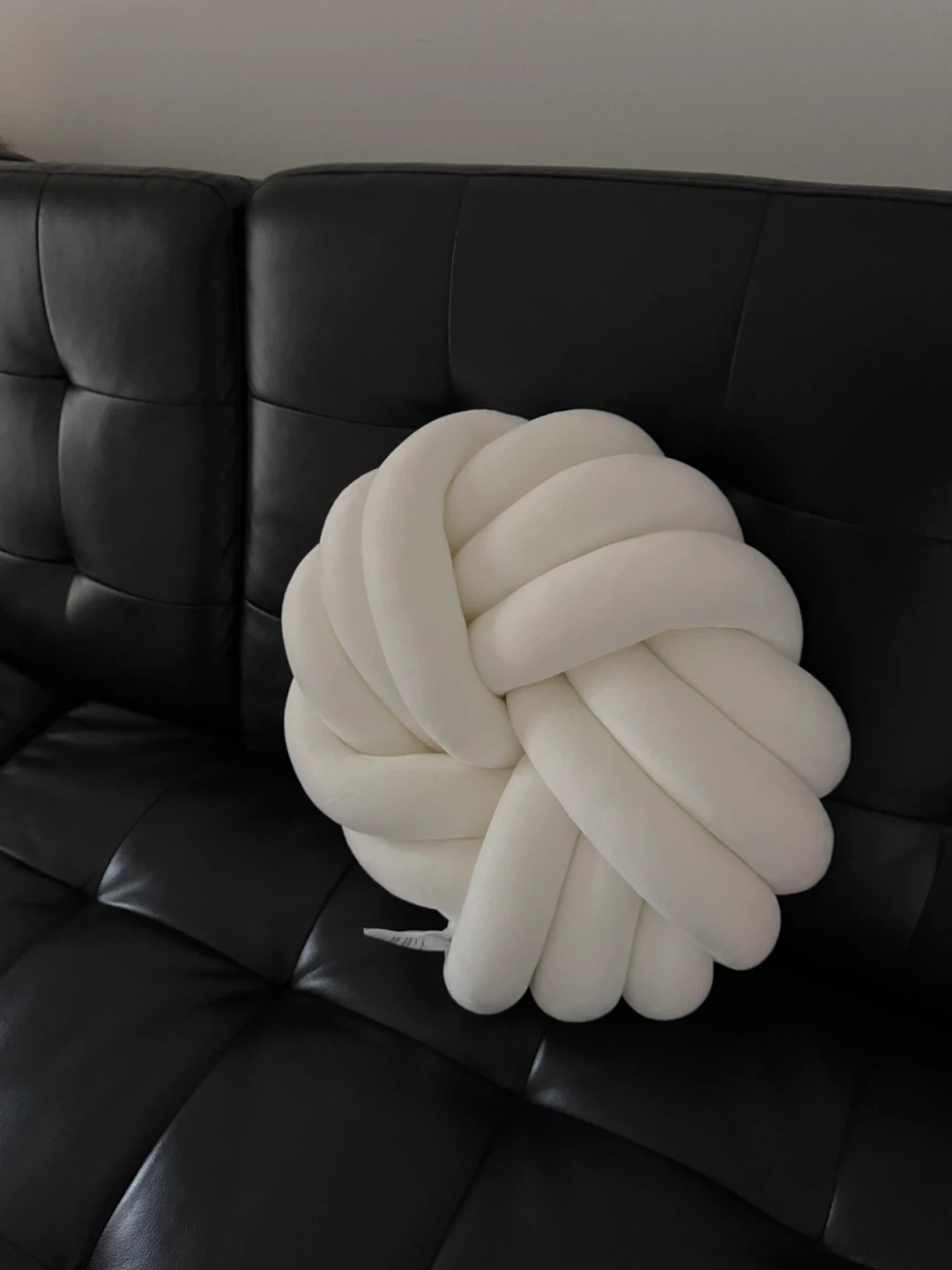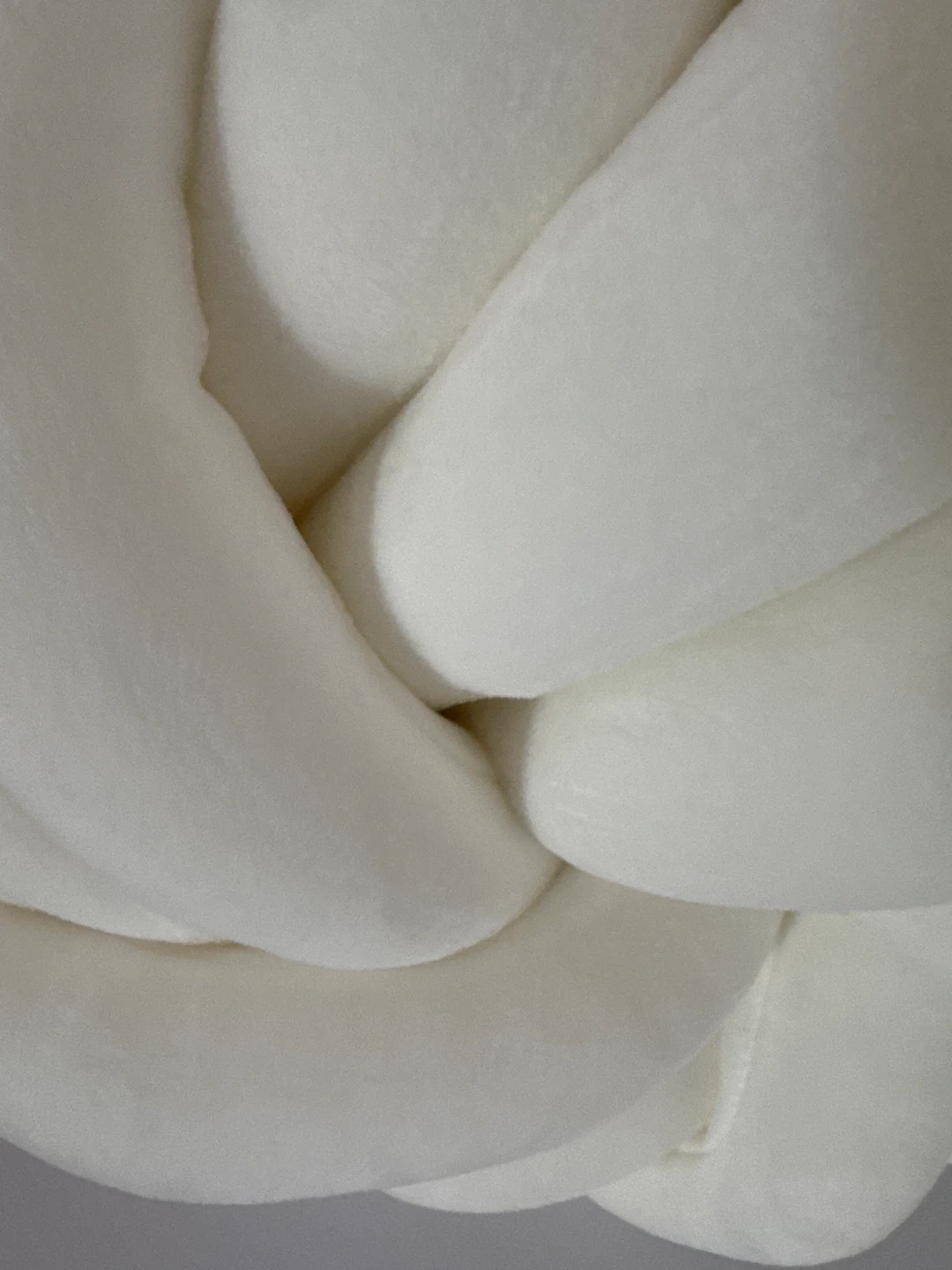 A soft, white throw pillow with a unique knotted ball design. Its plush material makes it comfy for lounging. It's a neat accent piece for any sofa or chair!