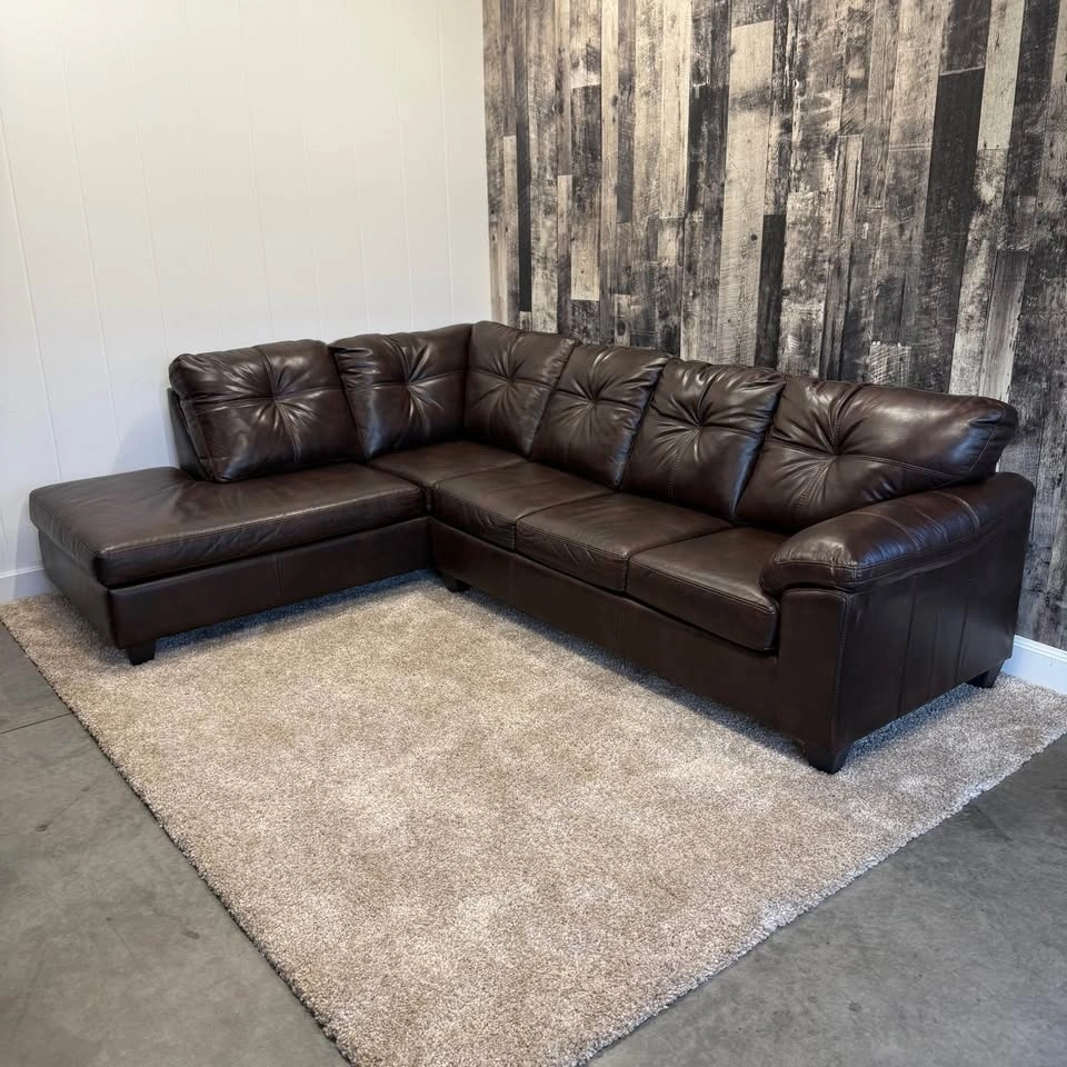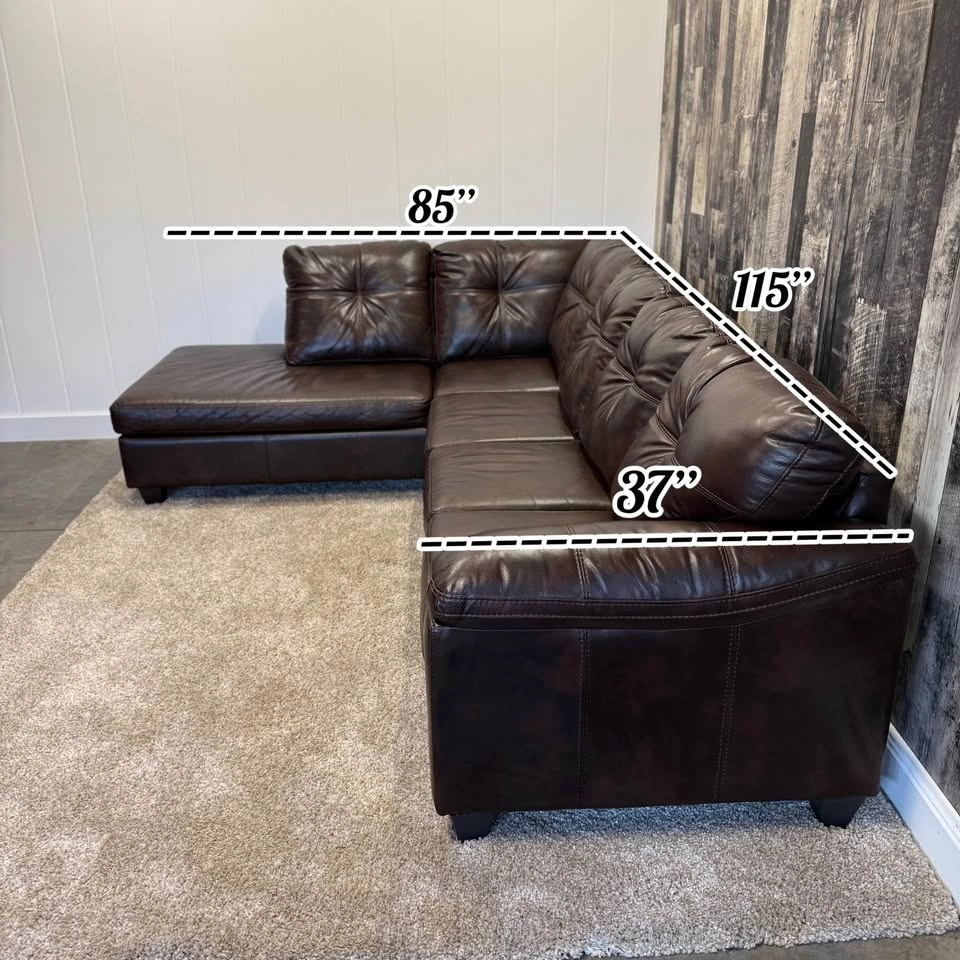 L-shaped sectional couch in rich brown faux leather. Tufted back cushions with a comfortable, supportive feel. Clean lines with low-profile legs. Solid frame with good structure throughout. Professionally cleaned and conditioned. From a non-smoking home — no stains, rips, or tears. Dimensions shown in the last photo. Check out my profile or join my group “That Couch Guy” for first access to new inventory.