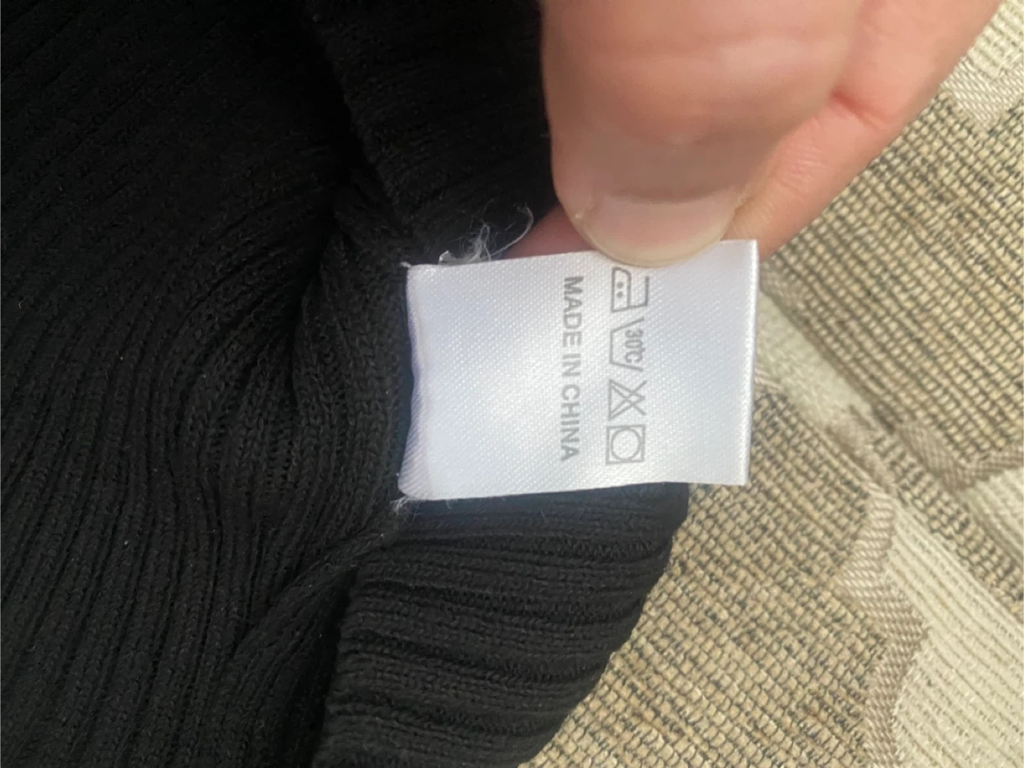 This is a black ribbed knit top from LUC-CE. It's made of 70% viscose and 30% polyester. Care instructions include washing at 30°C.