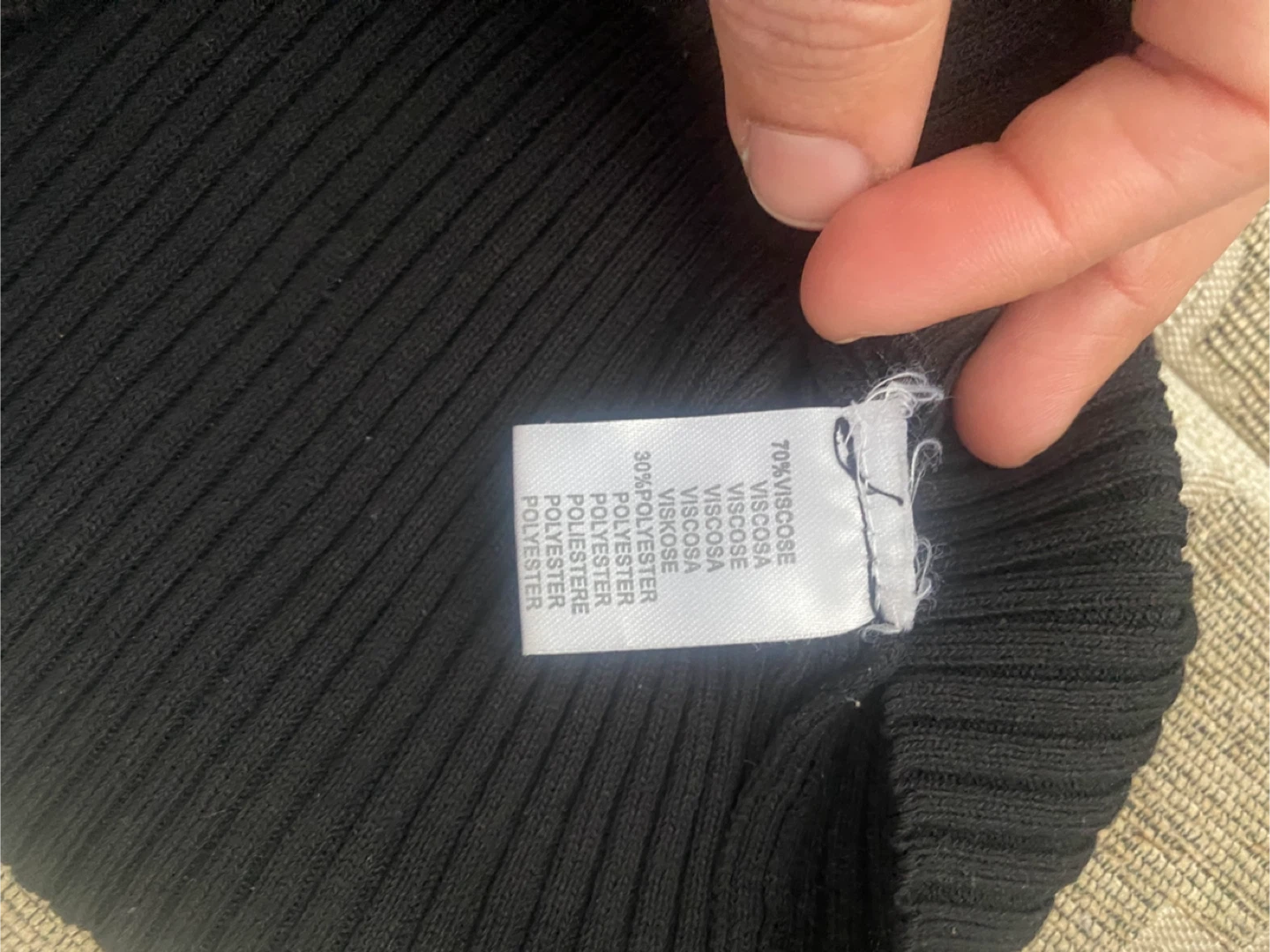 This is a black ribbed knit top from LUC-CE. It's made of 70% viscose and 30% polyester. Care instructions include washing at 30°C.