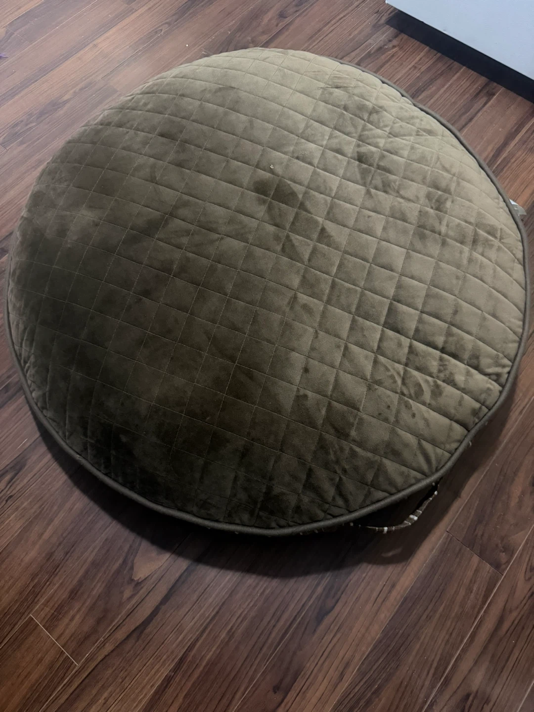 This is a Home4Dog round pet bed, measuring 42 inches in diameter. It's made with a 100% polyester cover and fill. This bed would be useful for a medium to large dog.