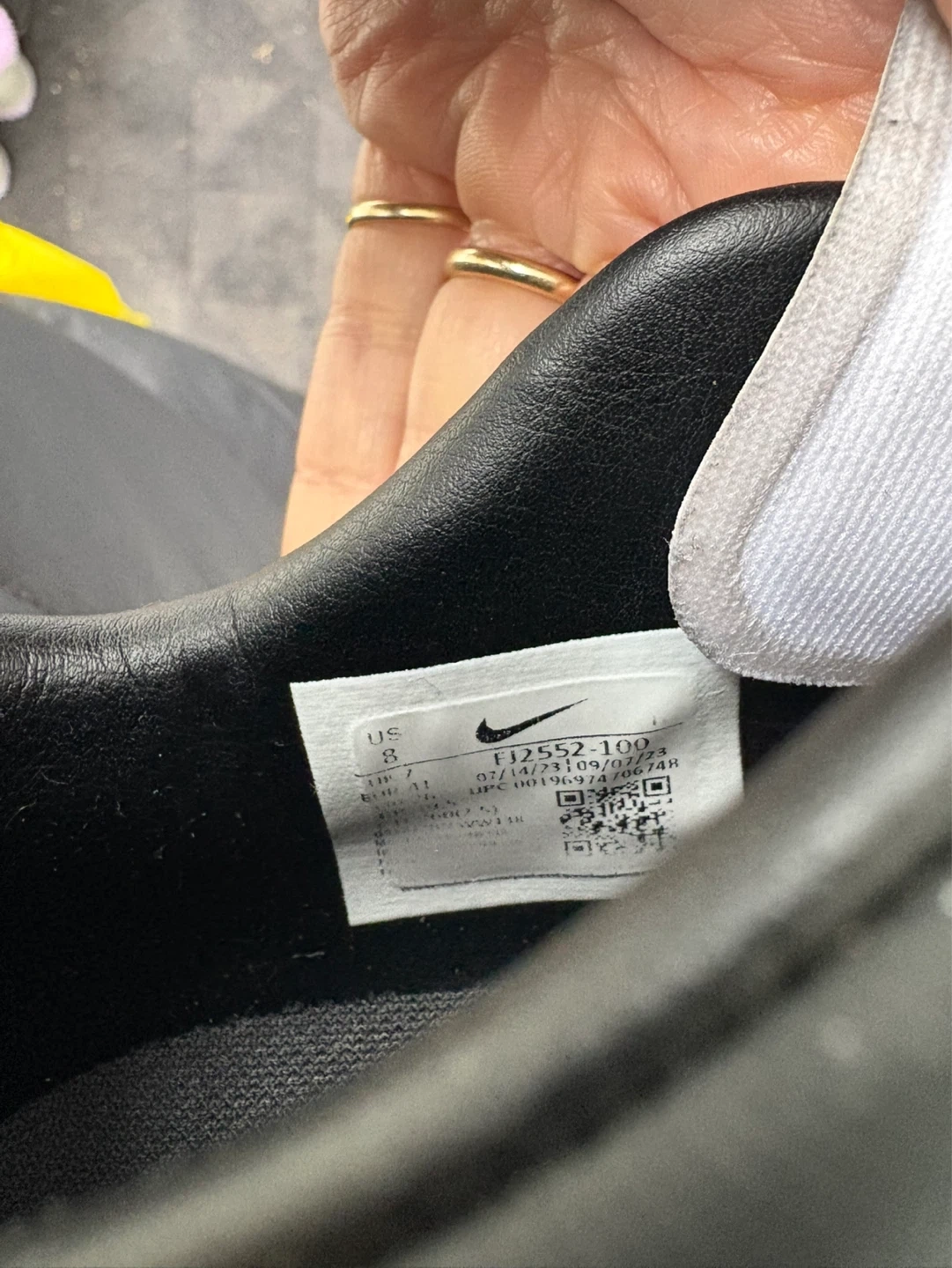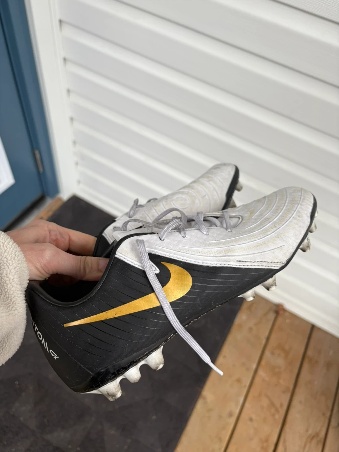 Nike Phantom GX soccer cleats in black and white with gold accents. Size US 8. Cleats are designed for firm ground play.