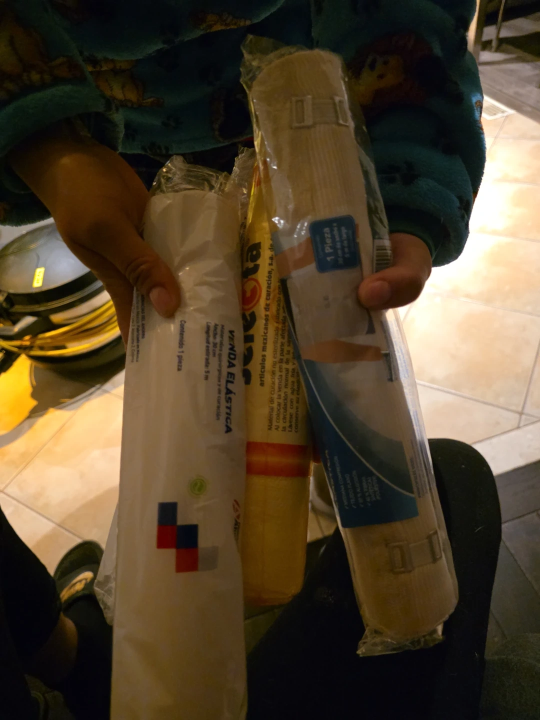 Lot of three elastic bandages, each containing one piece. The white bandage is 5 meters long and 30 cm wide. It's made of medical materials for curing and wound care. The other two bandages are of similar elastic construction. These are useful for supporting injuries.