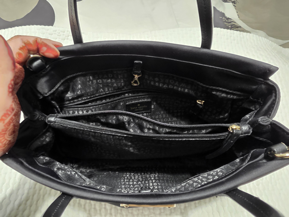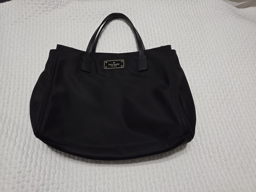 Here's a stylish black tote bag from Kate Spade! It's in great condition and perfect for everyday use. The interior lining features the Kate Spade logo. A versatile and chic addition to any wardrobe!