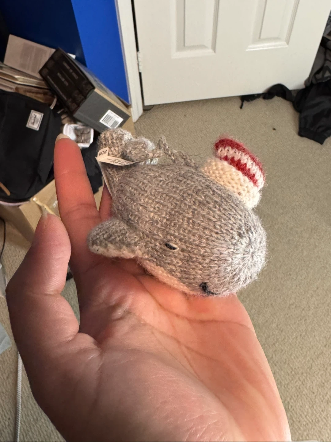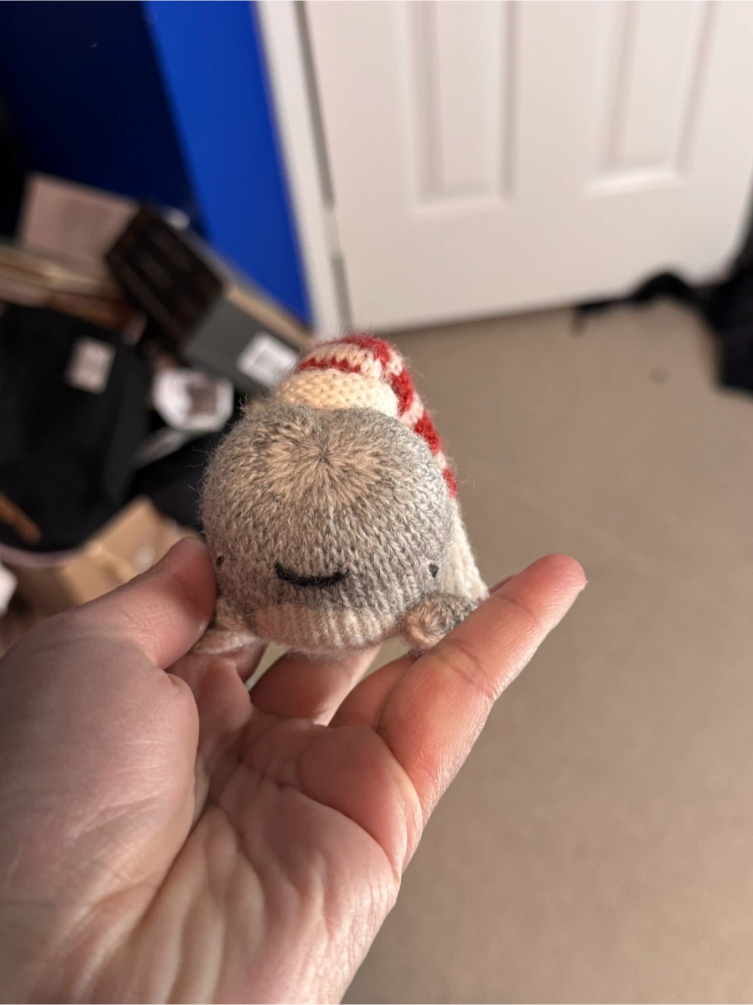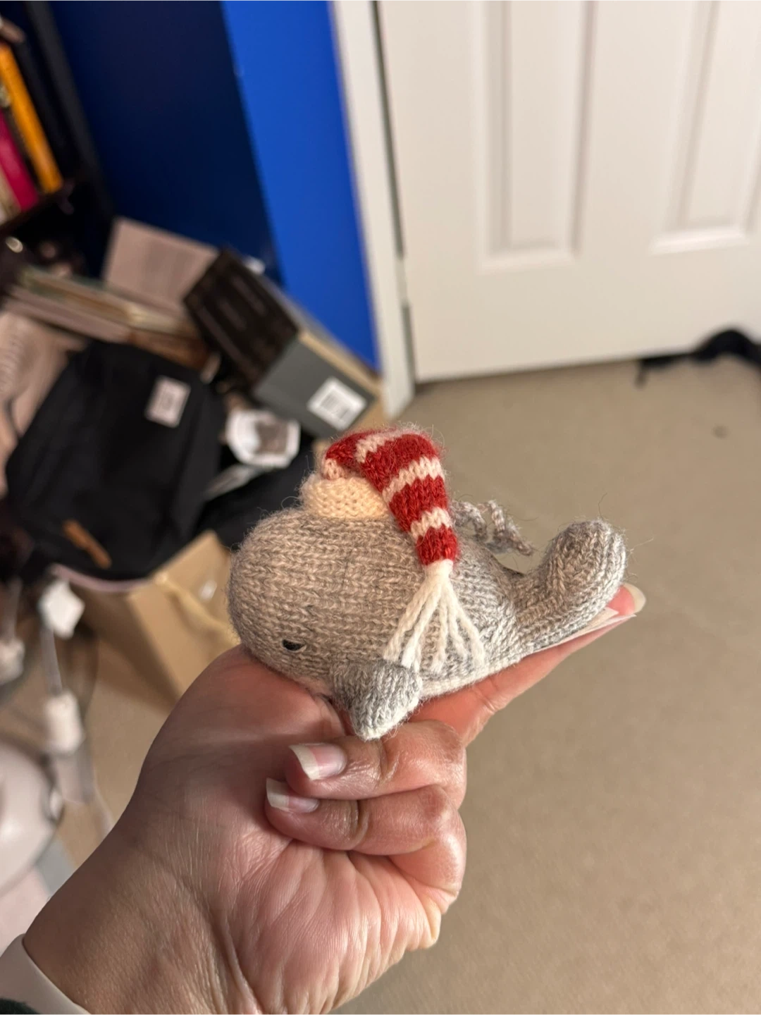 This is a cute, small, grey knitted whale ornament. It's wearing a red and white striped hat. Perfect for hanging on a Christmas tree or as a little decoration!