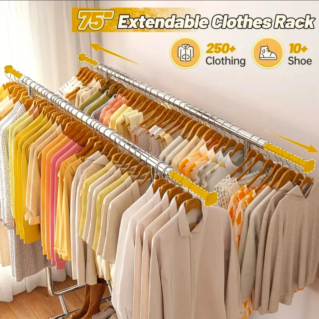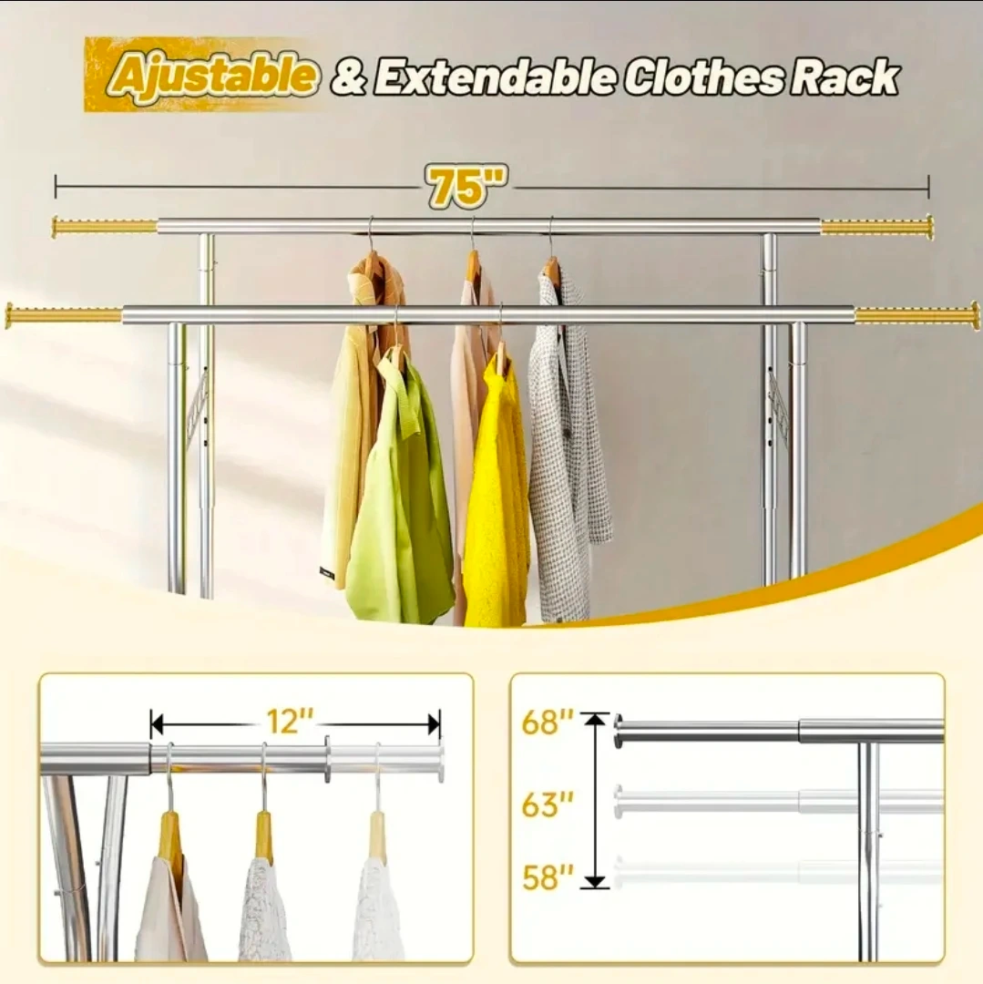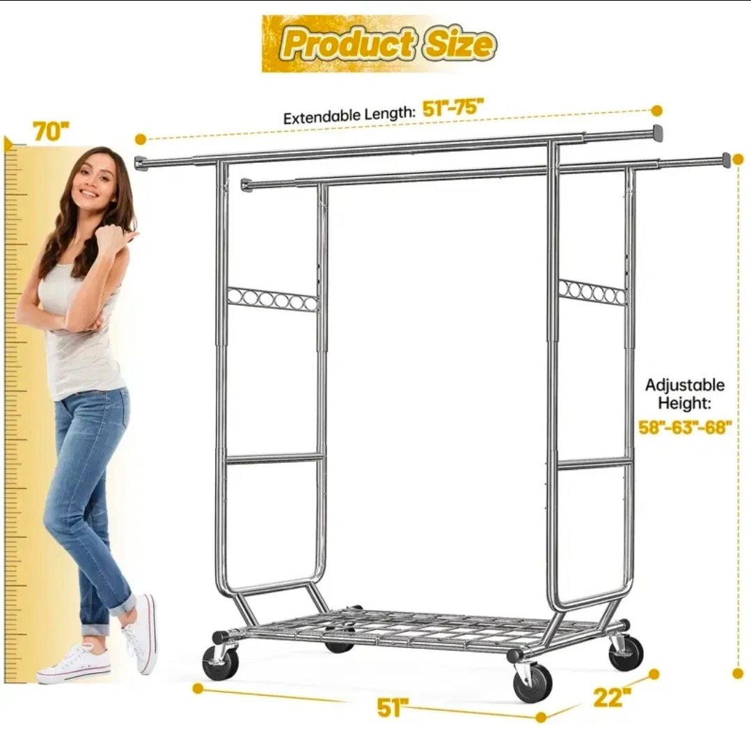 This double-rod garment rack is extendable from 51" to 75" and adjustable in height from 58" to 68". It features lockable casters for easy mobility. Constructed from metal, it's built for durability. This rack is handy for organizing clothes and shoes in any room.