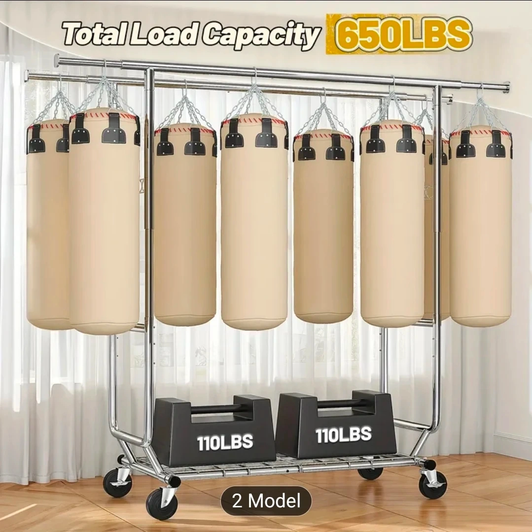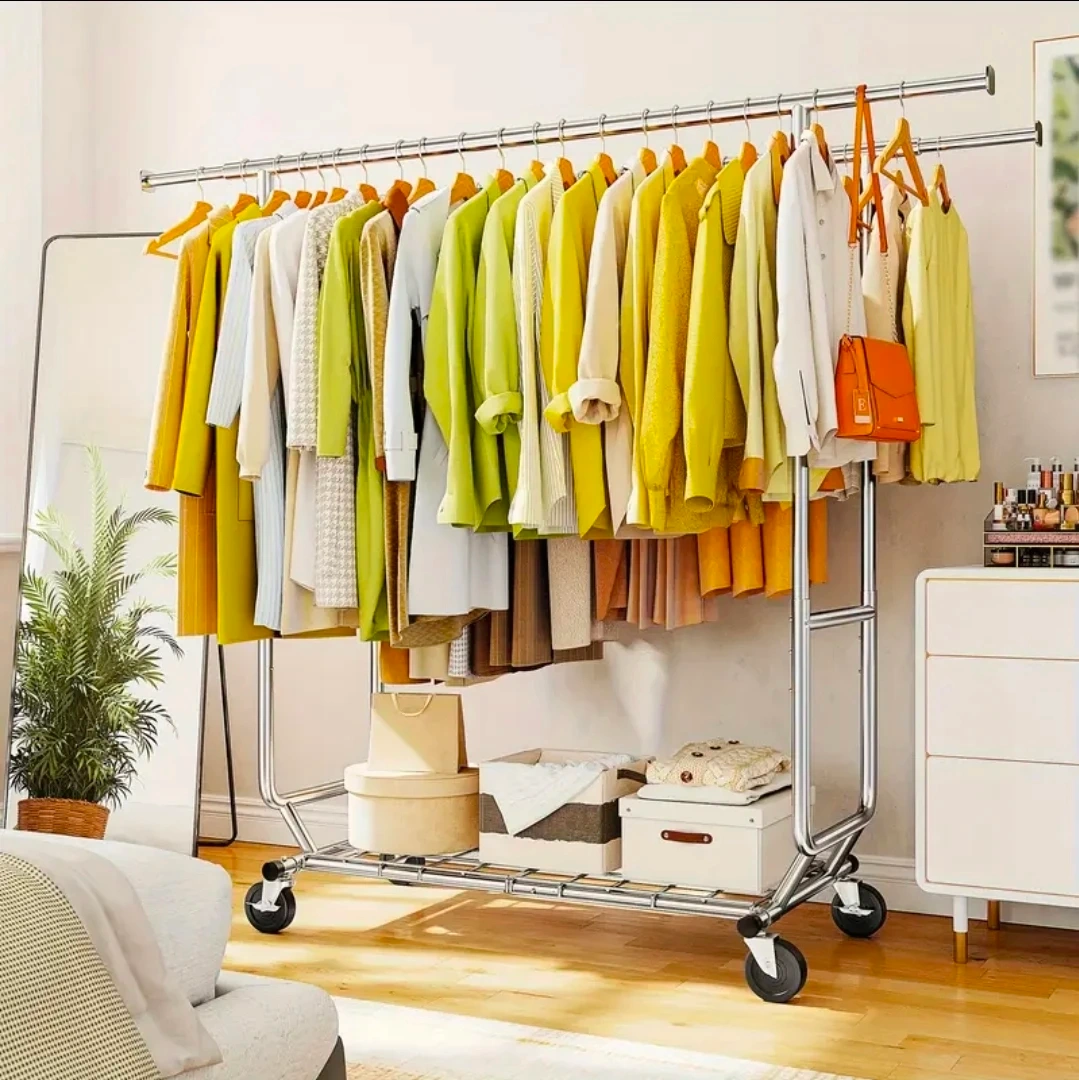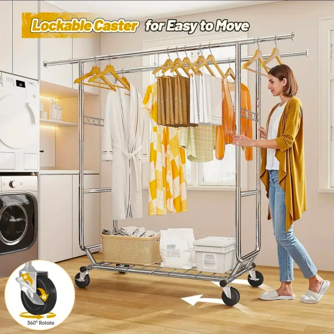 This double-rod garment rack is extendable from 51" to 75" and adjustable in height from 58" to 68". It features lockable casters for easy mobility. Constructed from metal, it's built for durability. This rack is handy for organizing clothes and shoes in any room.
