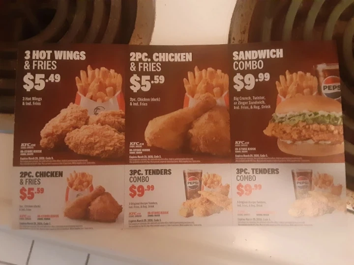 This is a KFC coupon for 3 Hot Wings & Fries for $5.49. It includes 3 hot wings and individual fries. Expiration date is March 29, 2006. This coupon is for in-store use