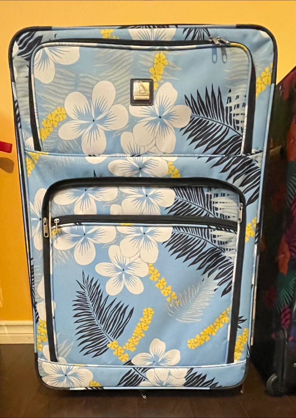 Selling a suitcase with a lovely Hawaiian floral pattern! It has never been used and ready for your next trip. The interior is spacious with black lining and straps to keep your belongings secure. The suitcase also comes with carry on matching bag.