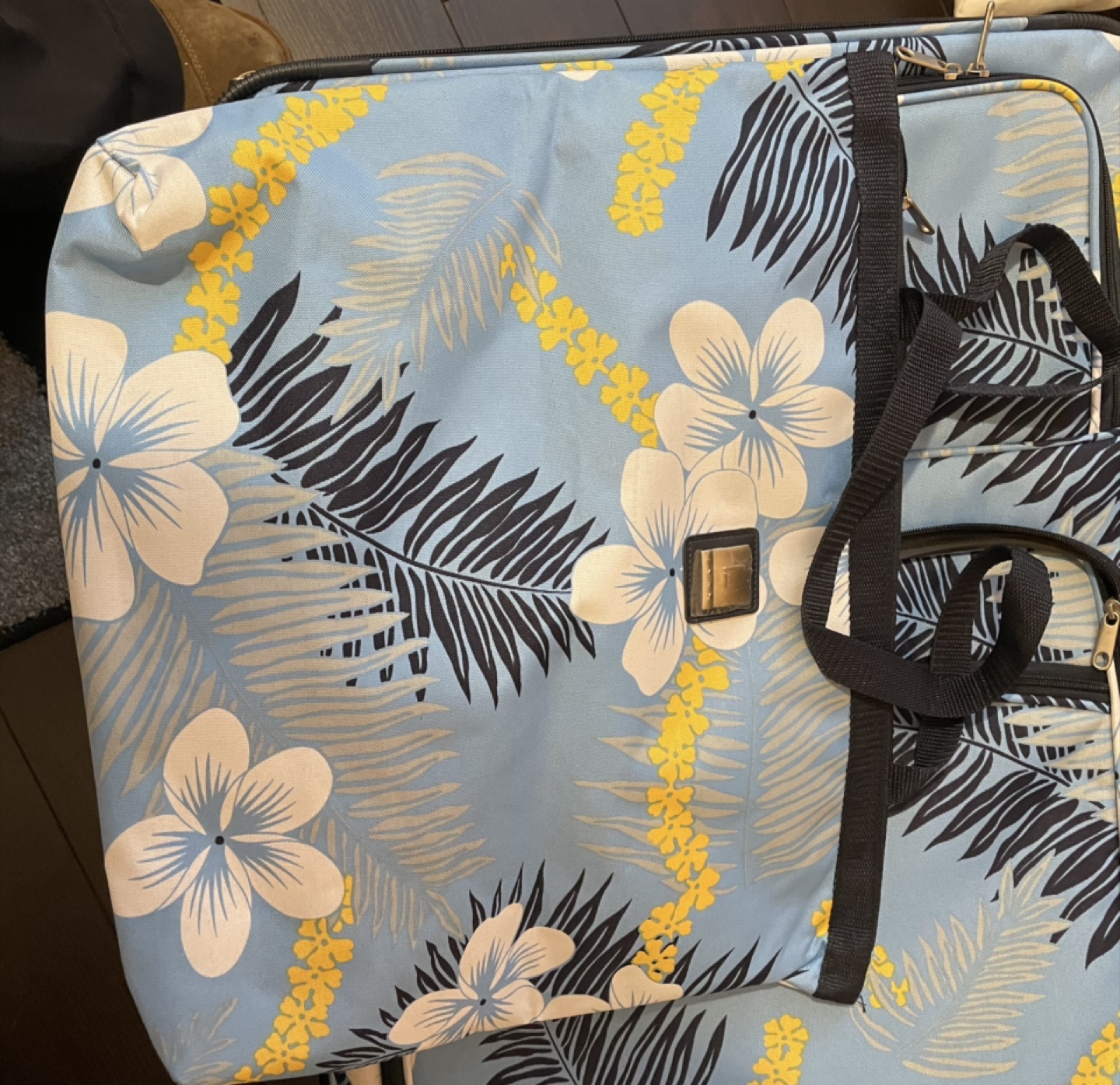 Selling a suitcase with a lovely Hawaiian floral pattern! It has never been used and ready for your next trip. The interior is spacious with black lining and straps to keep your belongings secure. The suitcase also comes with carry on matching bag.