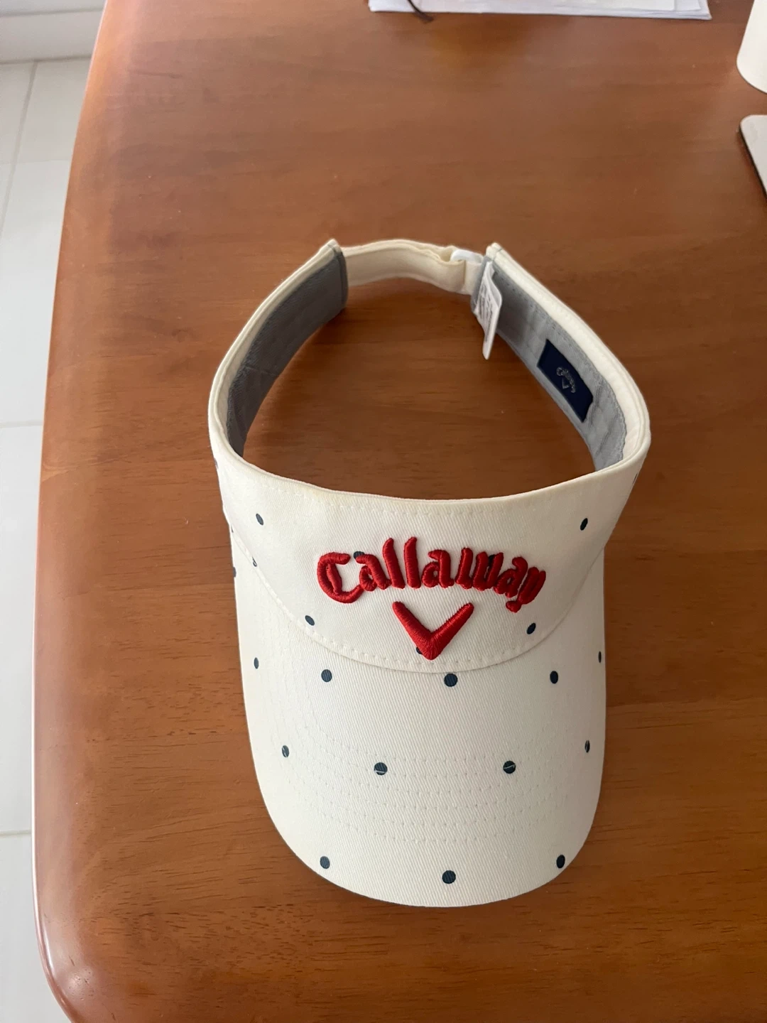 Keep the sun out of your eyes on the golf course with this stylish Callaway visor! It's white with navy blue polka dots and features the Callaway logo in red. Perfect for sunny days!