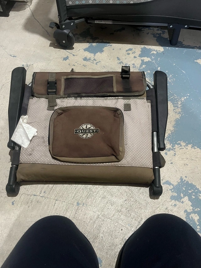 Get ready to relax with this Quest chair, perfect for camping, picnics, or any outdoor adventure. This chair has seen some action and is in used condition, ready for more memories. Features include a convenient carry bag and a sturdy frame. While this chair might not be brand new, it's eager to join you on your next adventure. Cash accepted.
