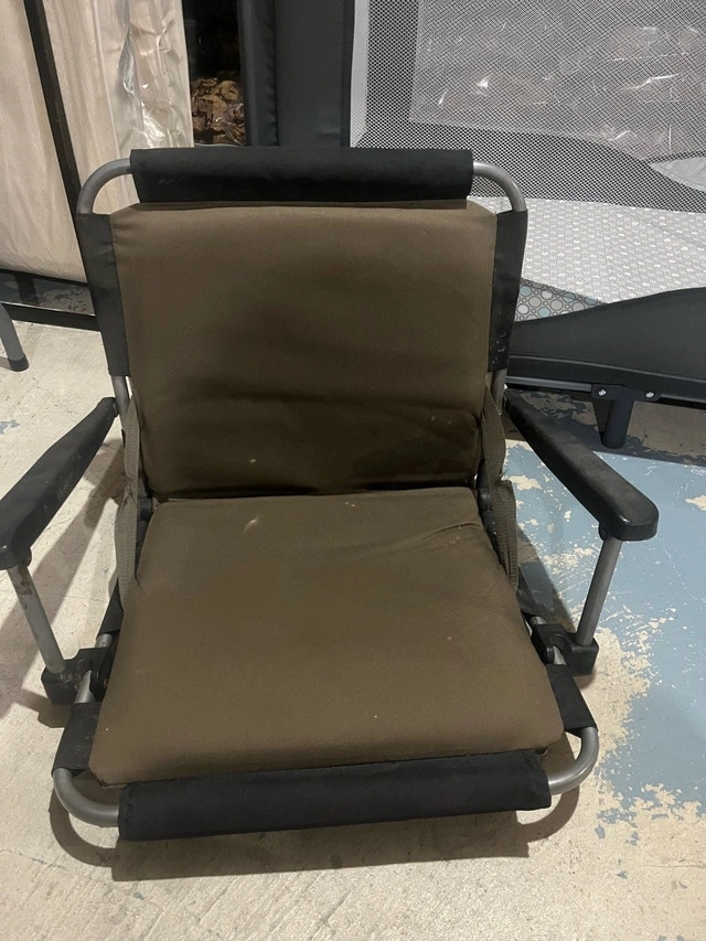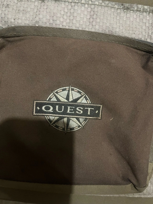 Get ready to relax with this Quest chair, perfect for camping, picnics, or any outdoor adventure. This chair has seen some action and is in used condition, ready for more memories. Features include a convenient carry bag and a sturdy frame. While this chair might not be brand new, it's eager to join you on your next adventure. Cash accepted.
