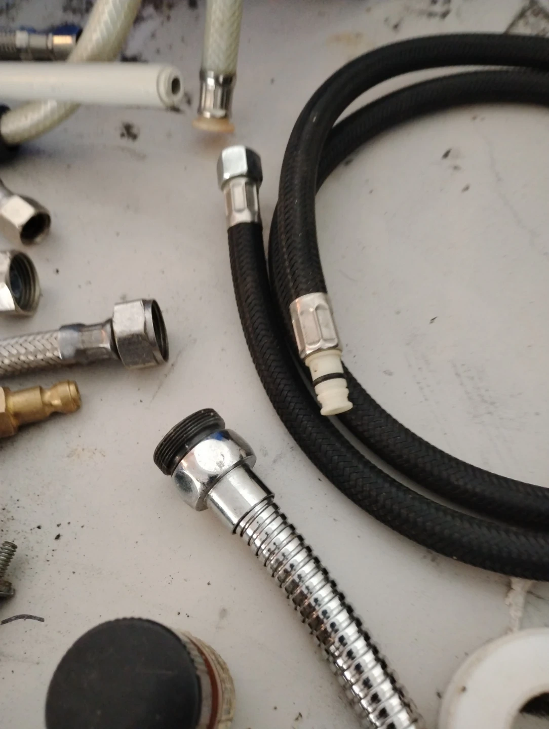 Includes various brass fittings, flexible hoses, a pipe cutter, and pliers. Most fittings appear to be for plumbing connections. Comes with Teflon tape and a handheld sprayer attachment.