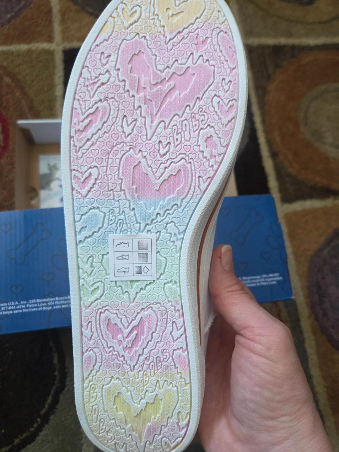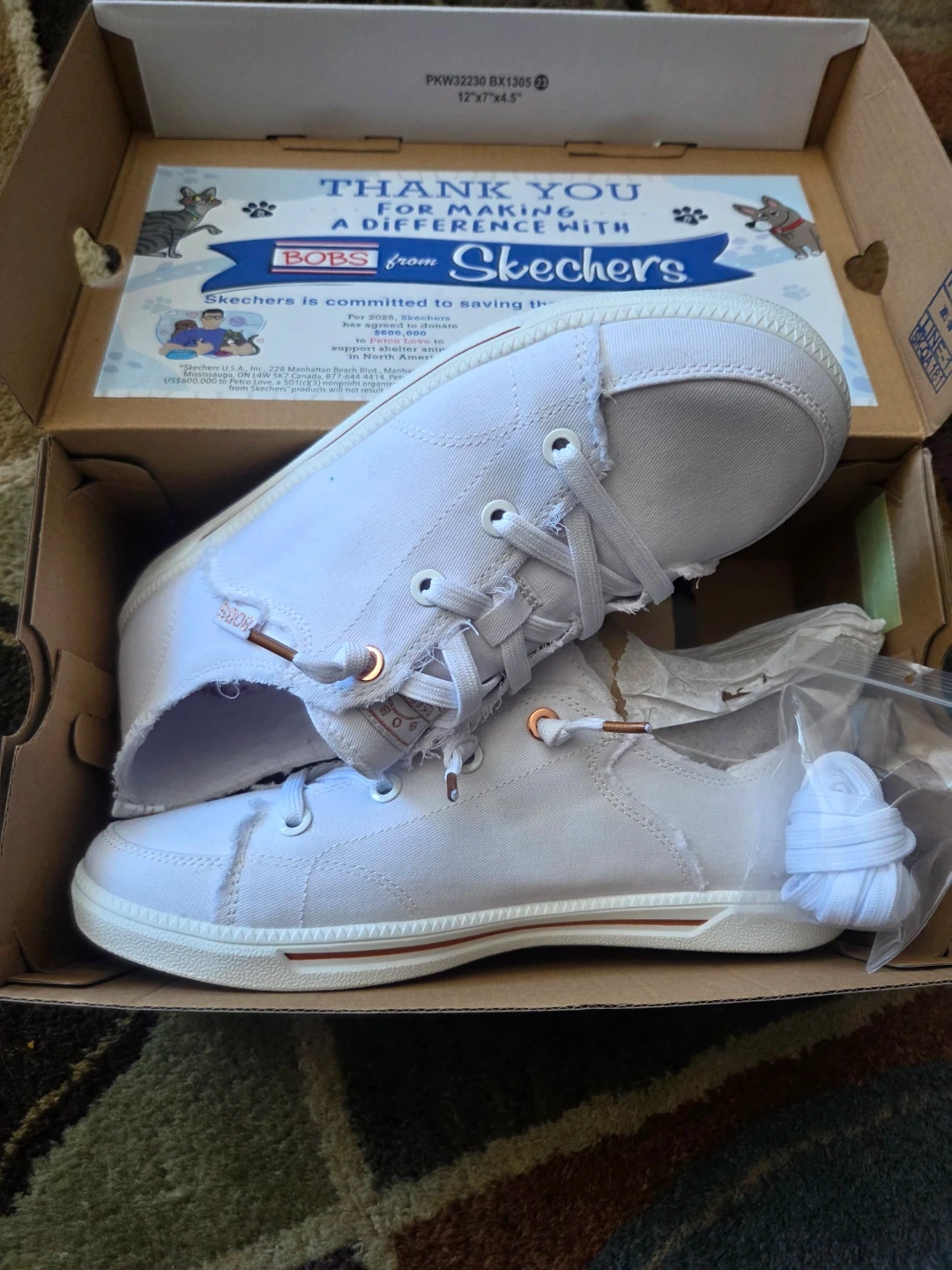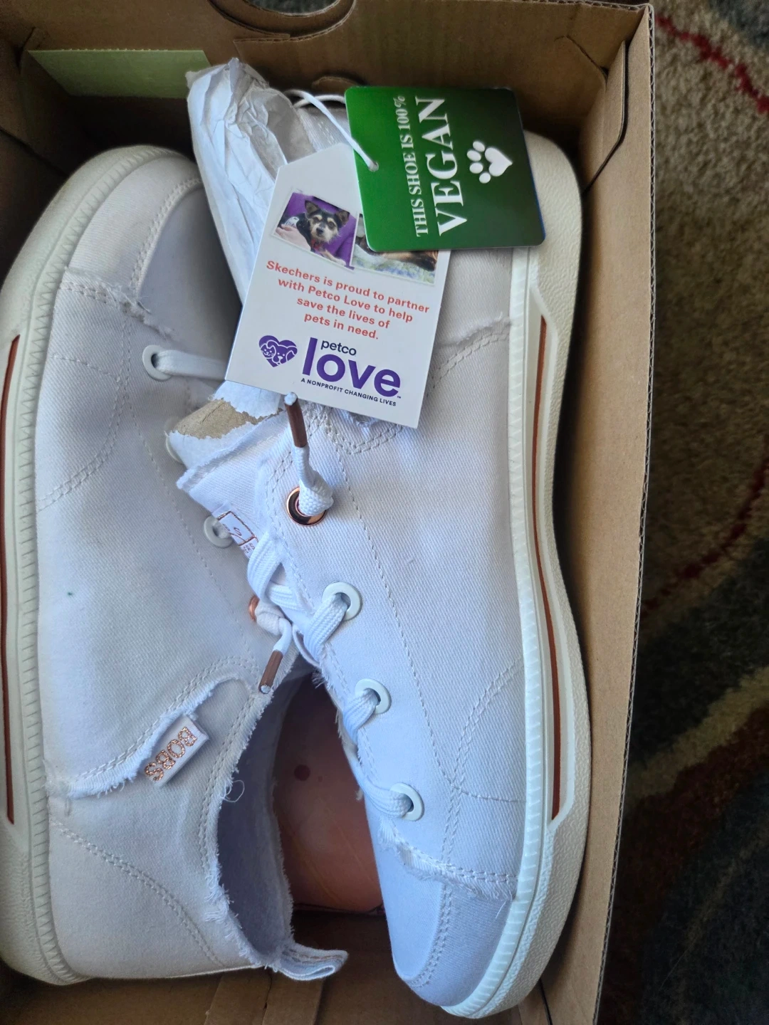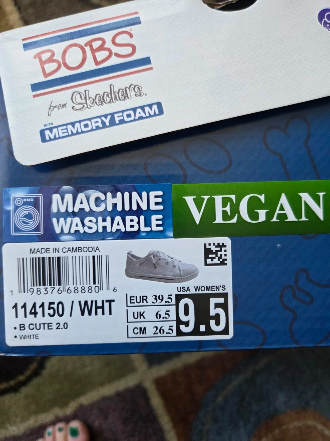 These BOBS from Skechers B Cute 2.0 sneakers are white and a women's size 9.5. They feature memory foam and are machine washable. These shoes are also vegan.