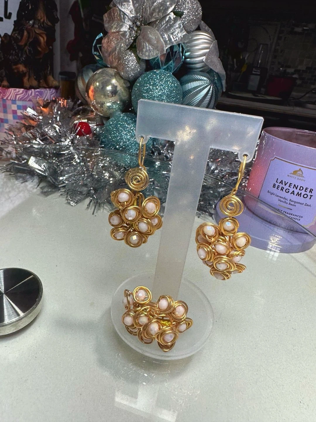 Selling a unique set of handmade earrings and a matching ring. The set features gold wire intricately woven around small, iridescent beads. A beautiful and eye-catching jewelry set!