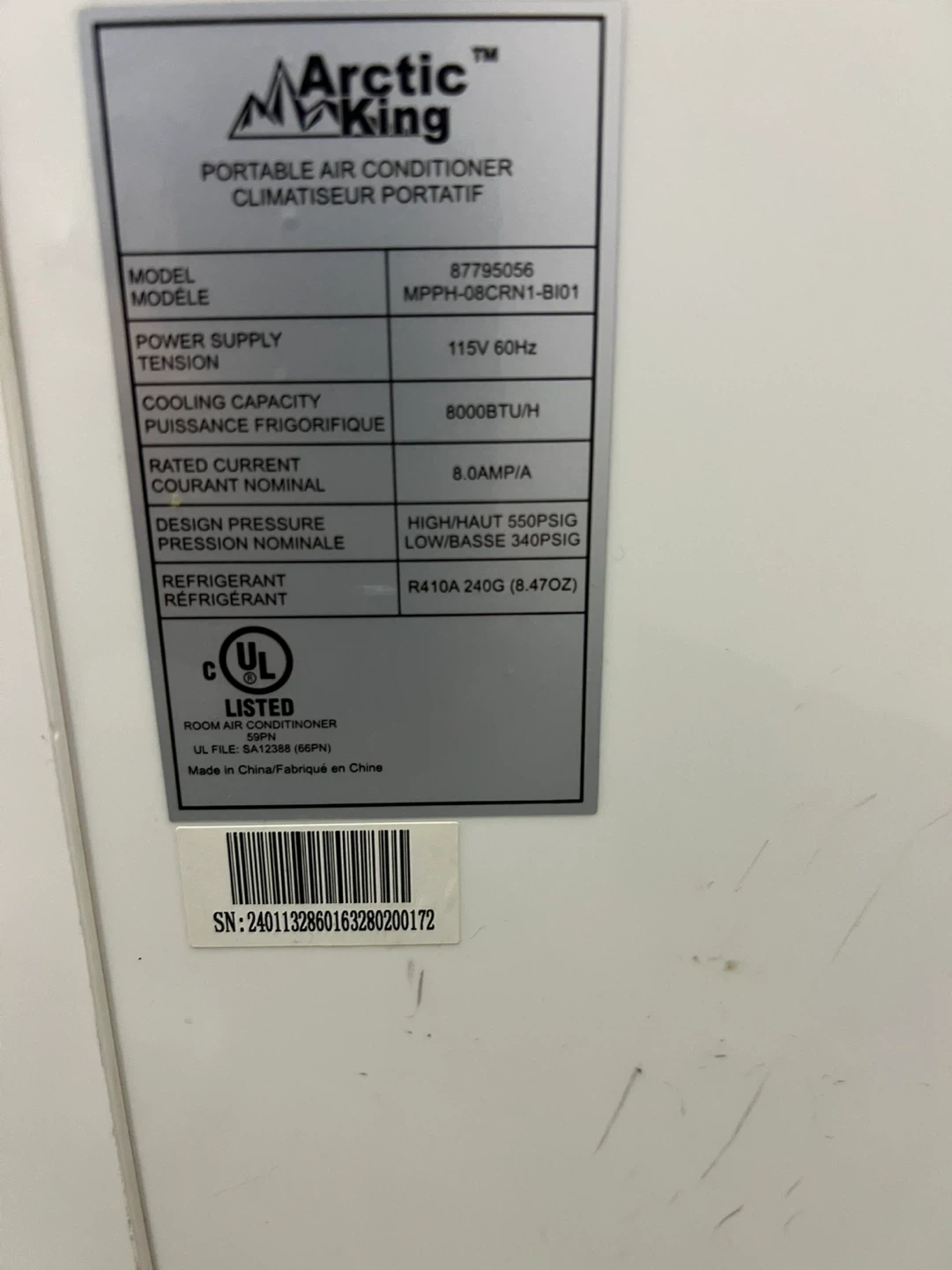 Arctic King portable air conditioner. Model MPPH-08CRN1-BI01. Cooling capacity is 8000 BTU/H. Powered by 115V 60Hz. This unit is great for keeping a single room cool.