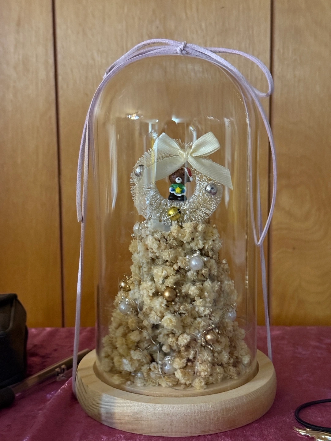 Miniature Christmas tree in a glass dome with a wooden base. Decorated with a wreath, lights and ornaments.