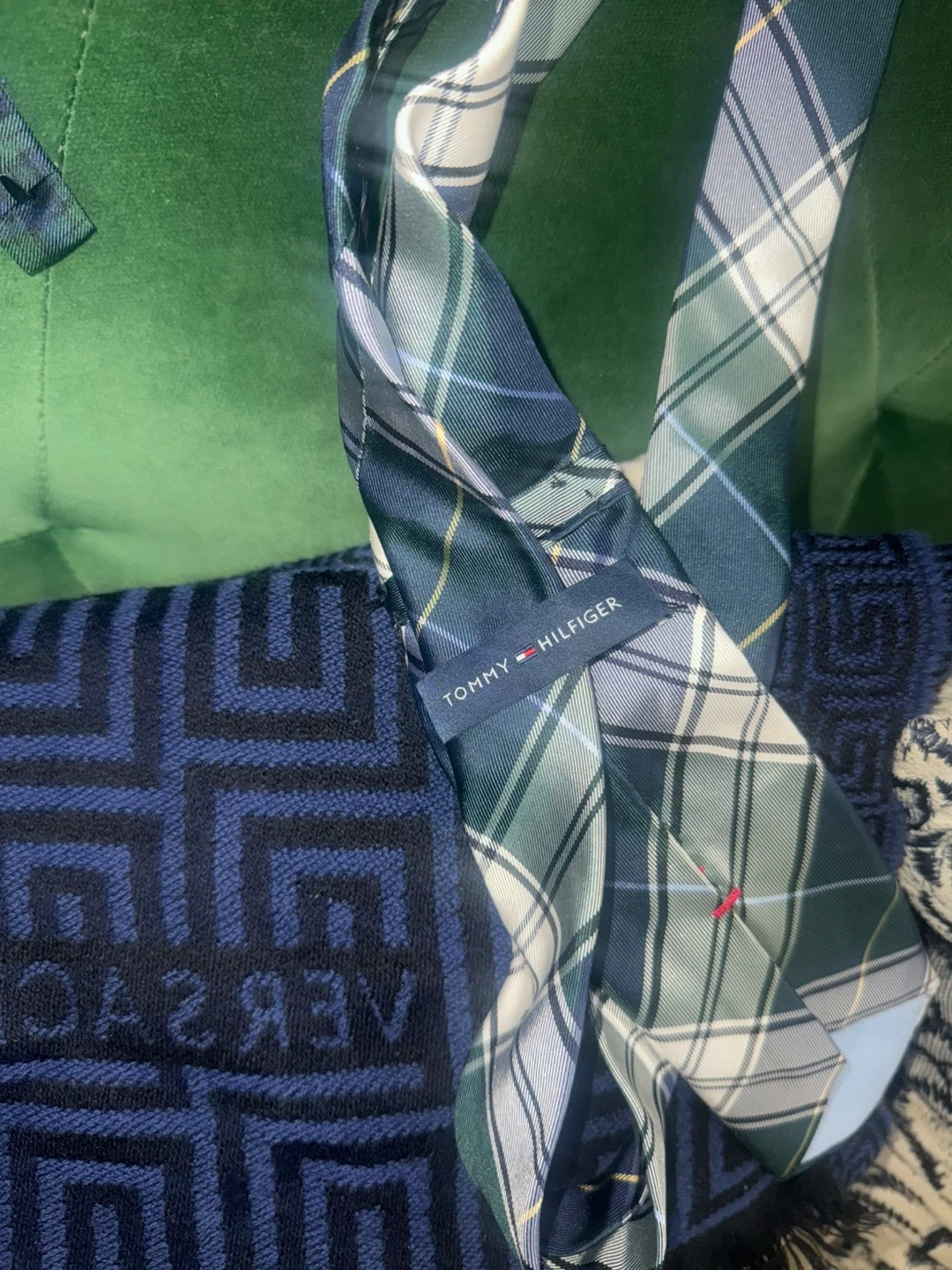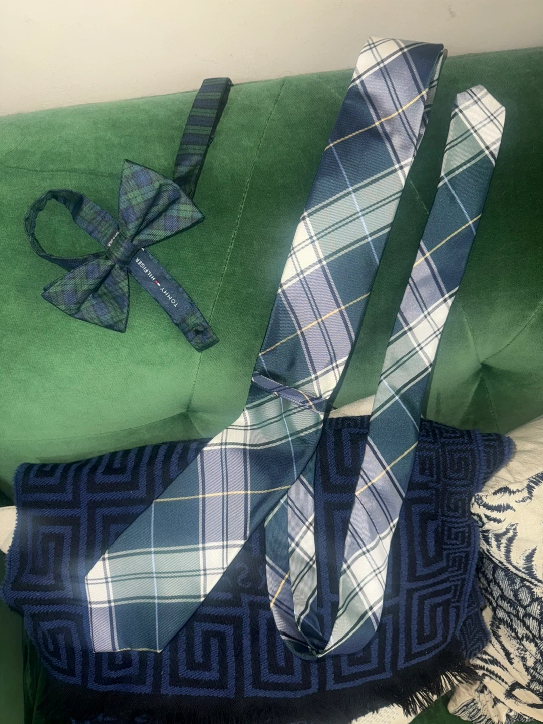 This set includes a Tommy Hilfiger necktie and a matching bow tie. Both accessories feature a classic plaid pattern in shades of navy, green, and white. They're made of a silky material suitable for formal or casual wear.