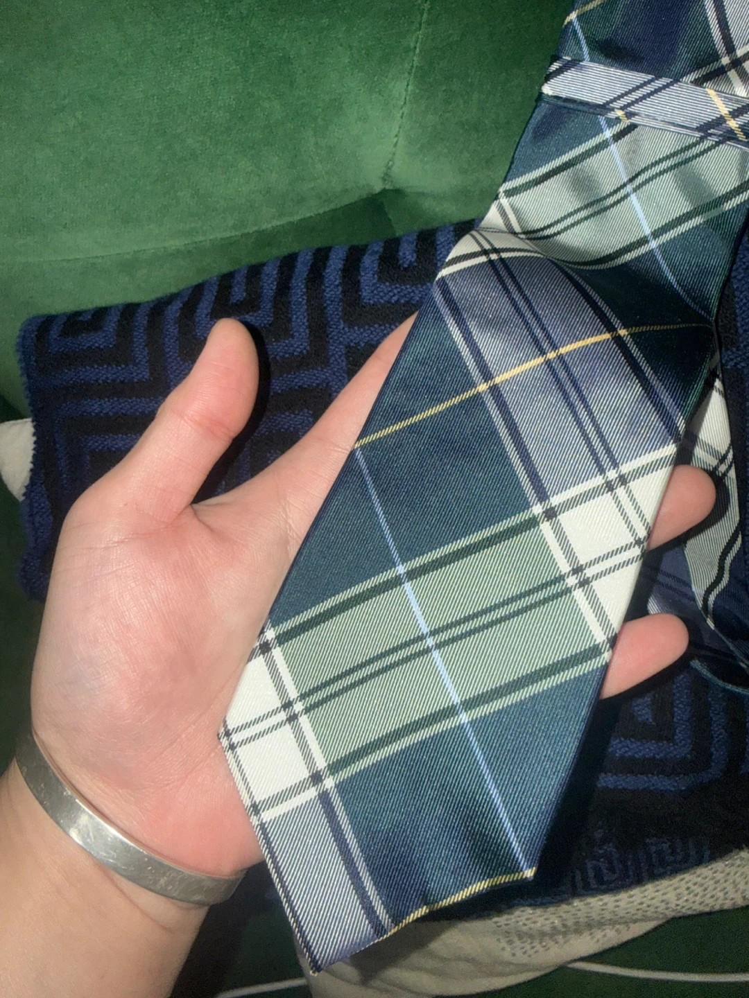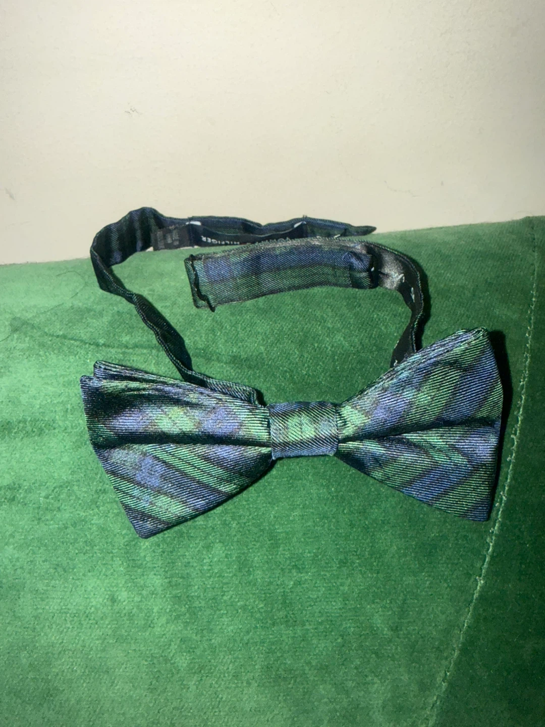 This set includes a Tommy Hilfiger necktie and a matching bow tie. Both accessories feature a classic plaid pattern in shades of navy, green, and white. They're made of a silky material suitable for formal or casual wear.