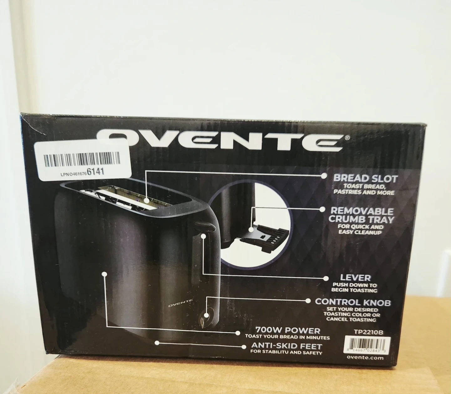 Ovente black 2-slice toaster with removable crumb tray. It has a 700W power output and a control knob for toasting colour. Lever to push down and begin toasting. Anti-skid feet for stability.