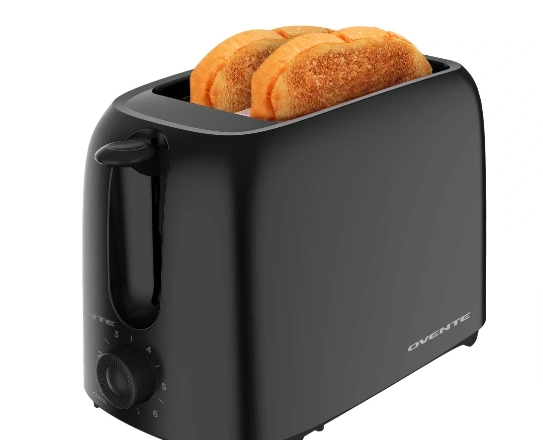 Ovente black 2-slice toaster with removable crumb tray. It has a 700W power output and a control knob for toasting colour. Lever to push down and begin toasting. Anti-skid feet for stability.