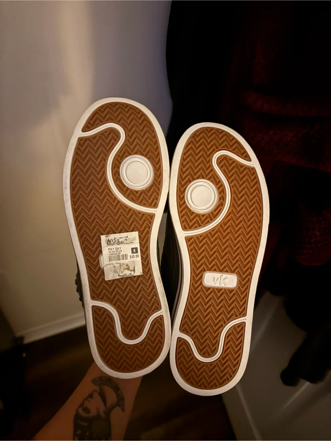 These Vans high-top sneakers are a cool grey with maroon accents and laces. They feature a studded detail on the sides. The soles have a classic waffle pattern for good grip. These would be great for everyday wear!