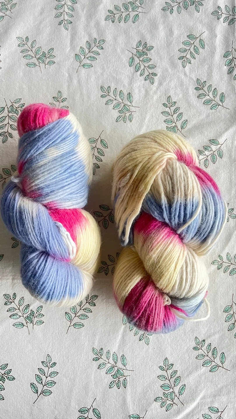 Destashing these two beautiful, oversized hand-dyed skeins! They are 180g each (nearly double a standard skein size), so there is plenty of yardage for a large cozy shawl or even a vest. It is bulky weight, so it is perfect for beginners and for a quick gift.
