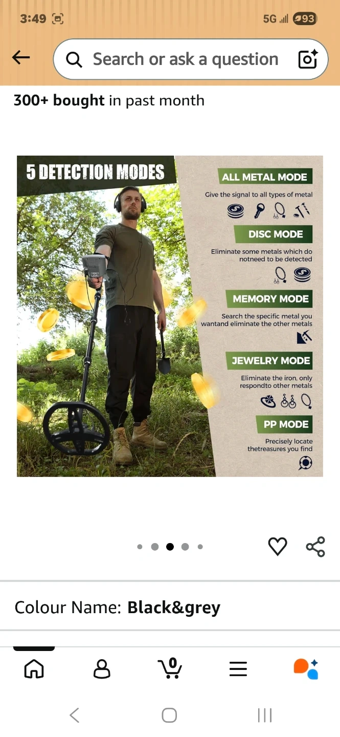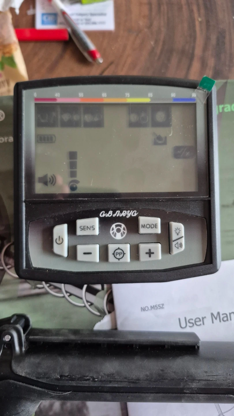 GBRRYG metal detector with adjustable sensitivity and multiple modes. It's black and grey, comes with its original box and user manual. Perfect for finding treasures in fields, forests, and beaches!