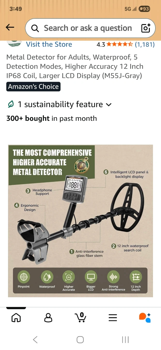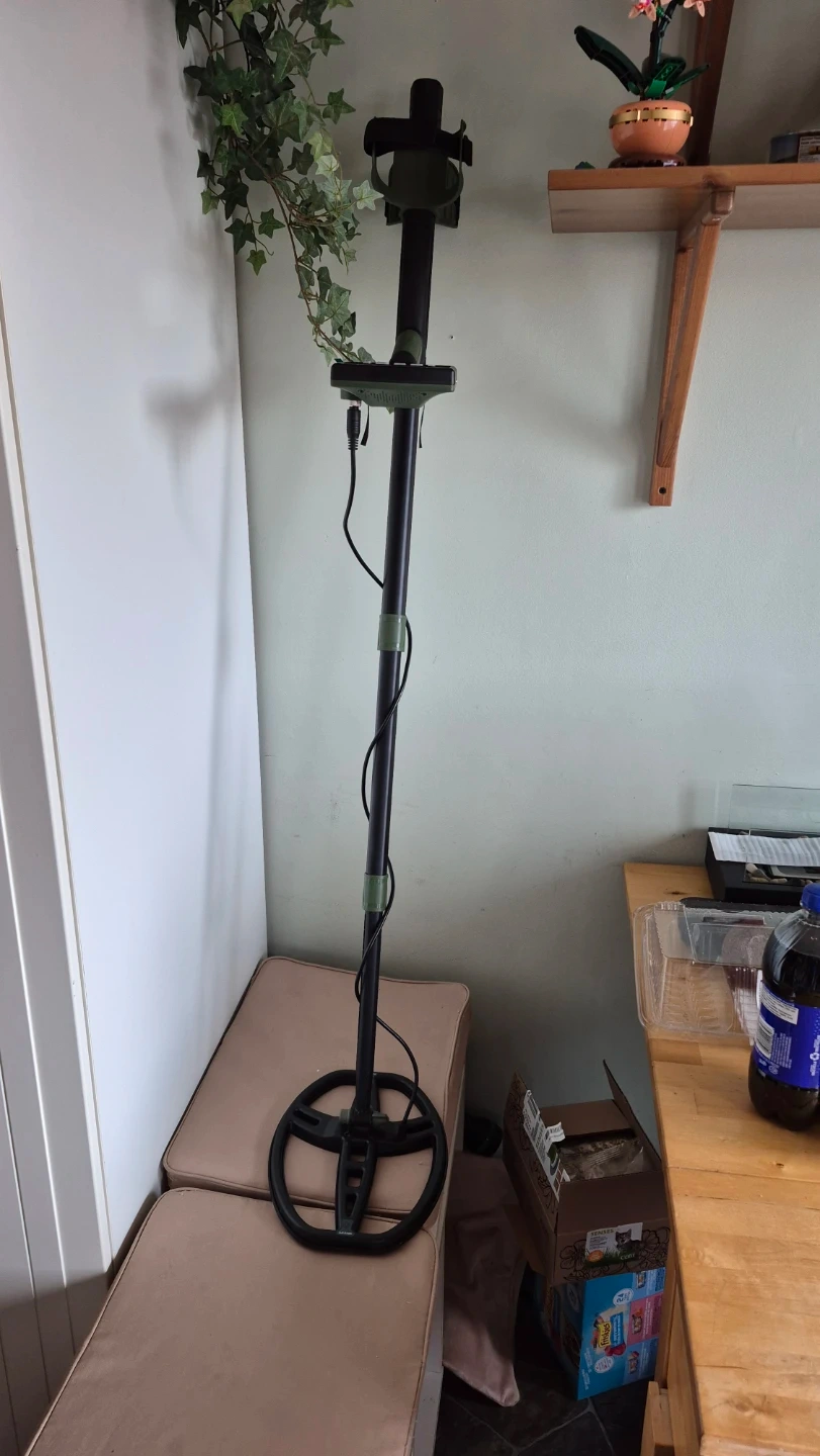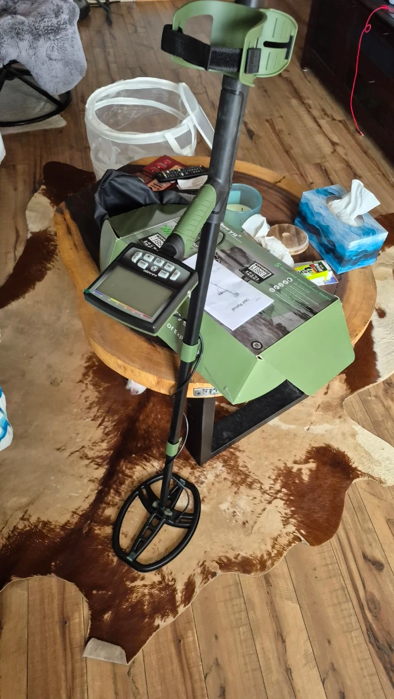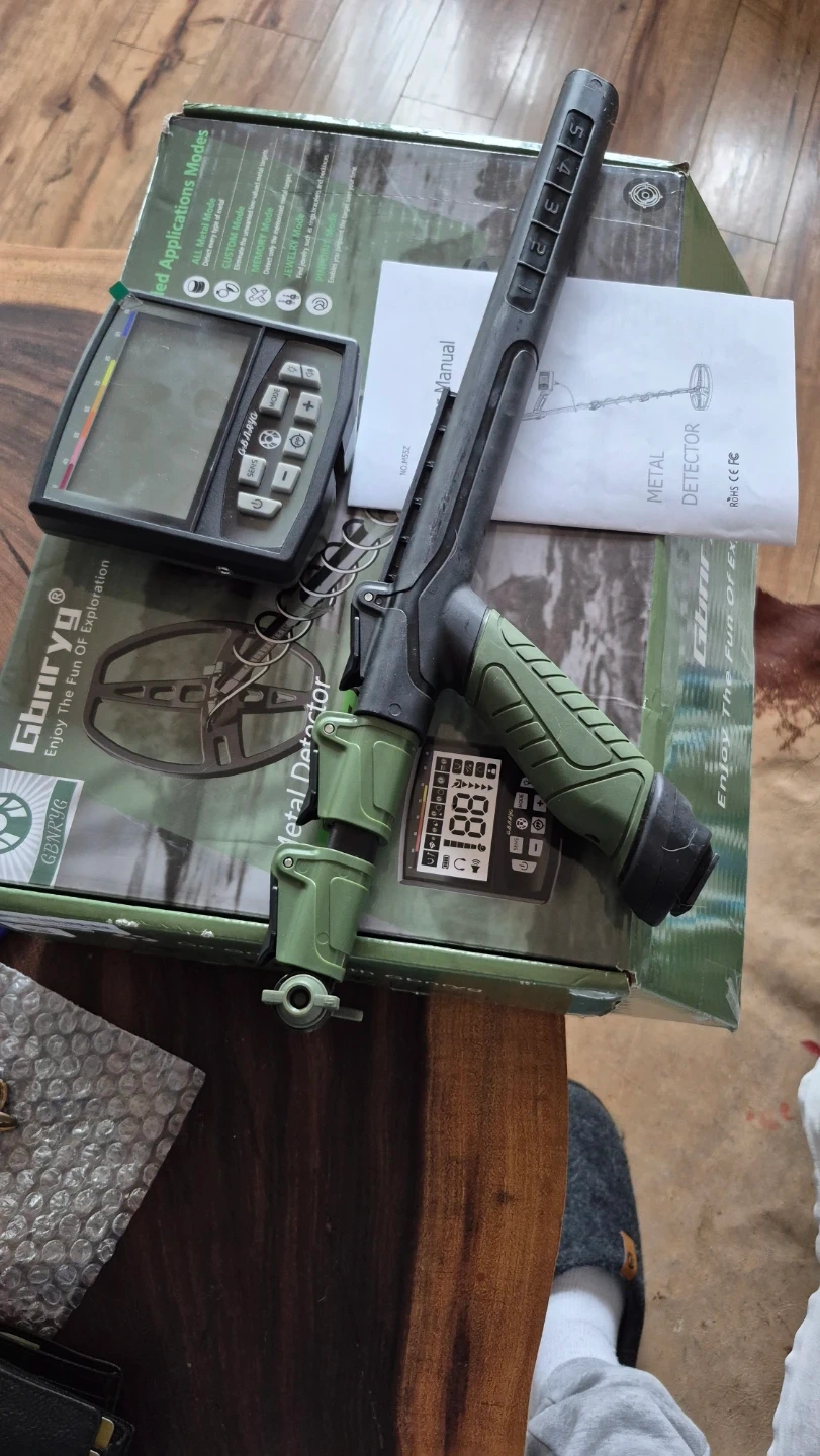 GBRRYG metal detector with adjustable sensitivity and multiple modes. It's black and grey, comes with its original box and user manual. Perfect for finding treasures in fields, forests, and beaches!