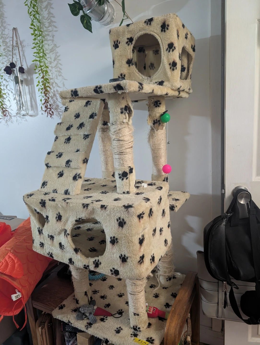 This multi-level cat tree features plush fabric with paw prints and multiple scratching posts wrapped in sisal rope. Well loved but still in great shape. Used for less than a year!
