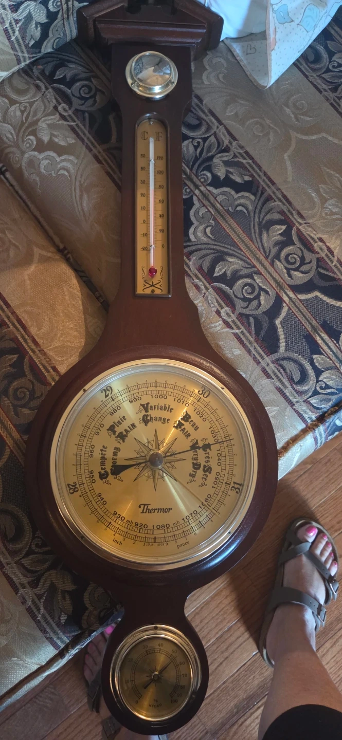 This is a vintage wooden wall unit featuring a Thermor barometer, thermometer, and hygrometer. The barometer indicates weather changes from storm to fair. It's a classic piece for monitoring indoor and outdoor conditions.
