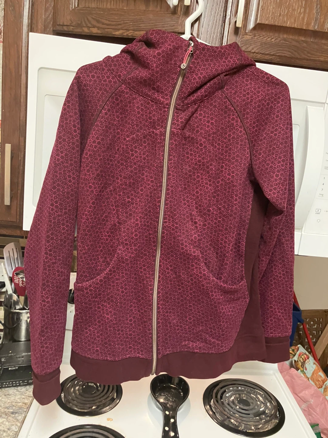 Selling a Lululemon hoodie in a lovely maroon and pink pattern! It's a size 12 and in great condition. Perfect for workouts or just lounging around. Feel free to message me with any questions!