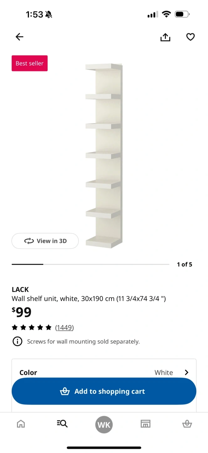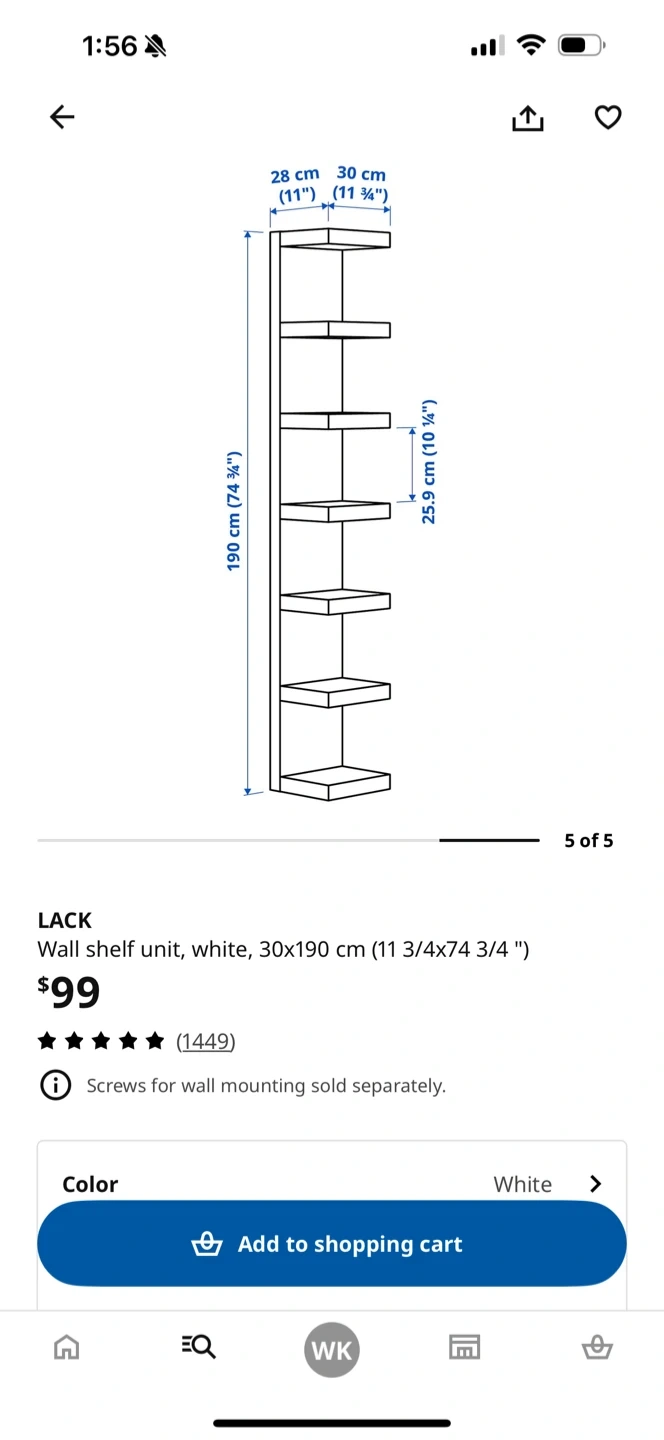 White IKEA LACK wall shelf unit, measuring 30x190 cm (11 3/4 x 74 3/4"). Screws for wall mounting sold separately. It's a tall and slim shelf unit.