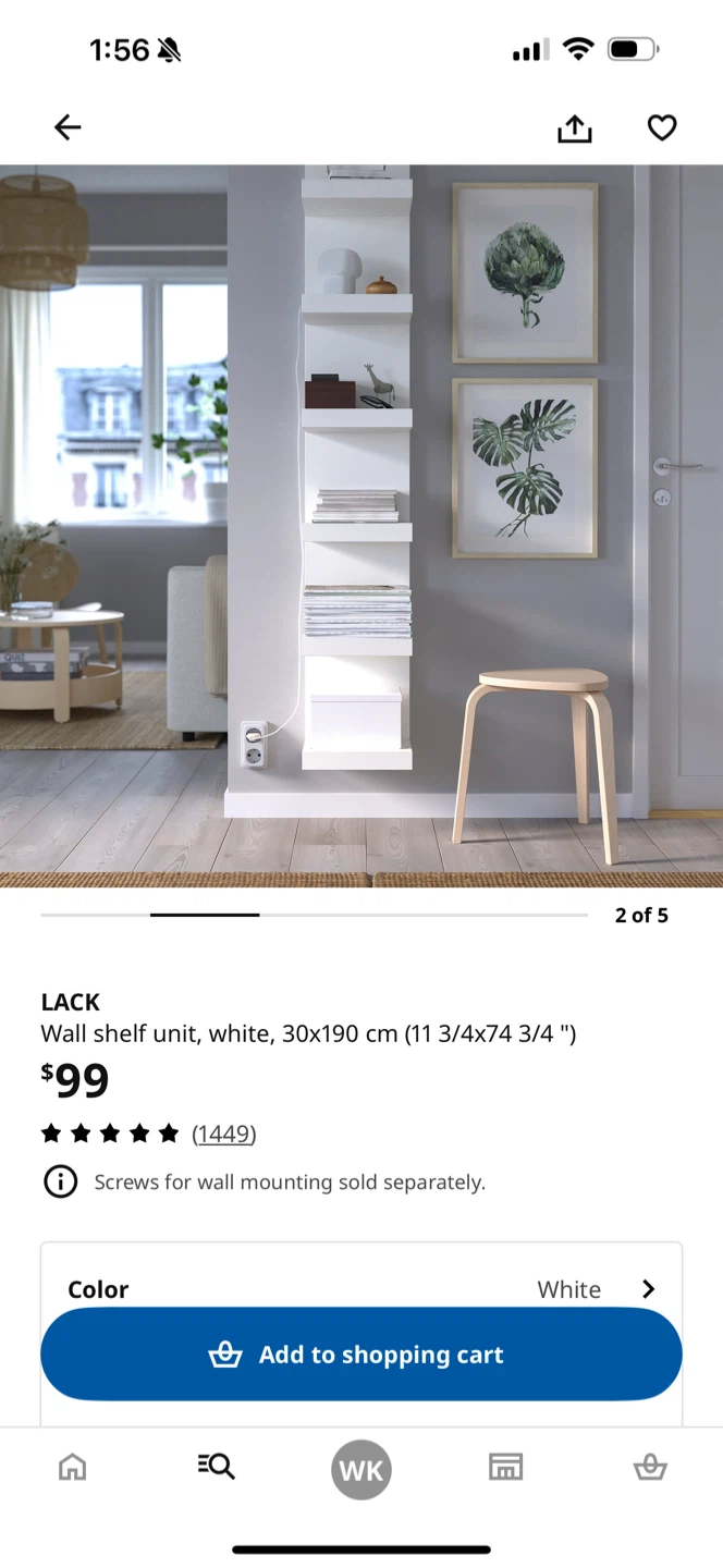 White IKEA LACK wall shelf unit, measuring 30x190 cm (11 3/4 x 74 3/4"). Screws for wall mounting sold separately. It's a tall and slim shelf unit.