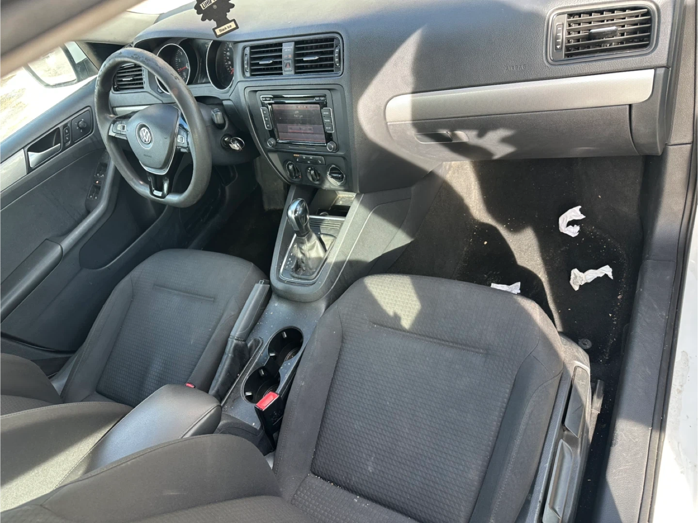This is a white Volkswagen Jetta sedan. It's a four-door car with black wheels. The interior features black cloth seats and a standard infotainment system.. car have transmission problems. it still run and drives. gear shifting late . 2015 active car . price is firm 2300$ no less . area downtown