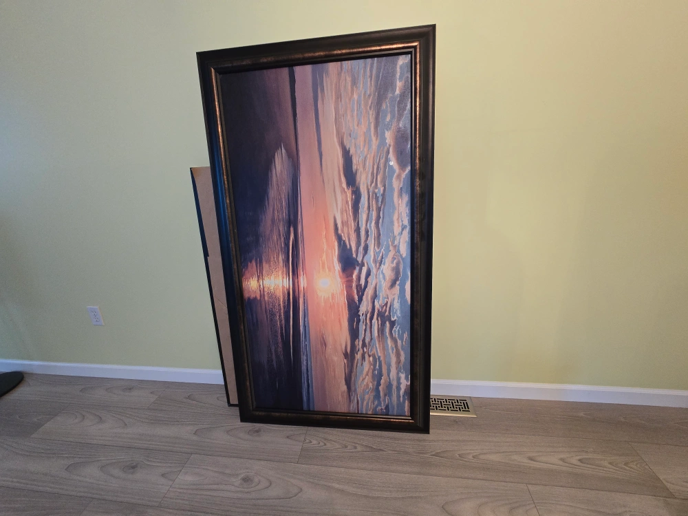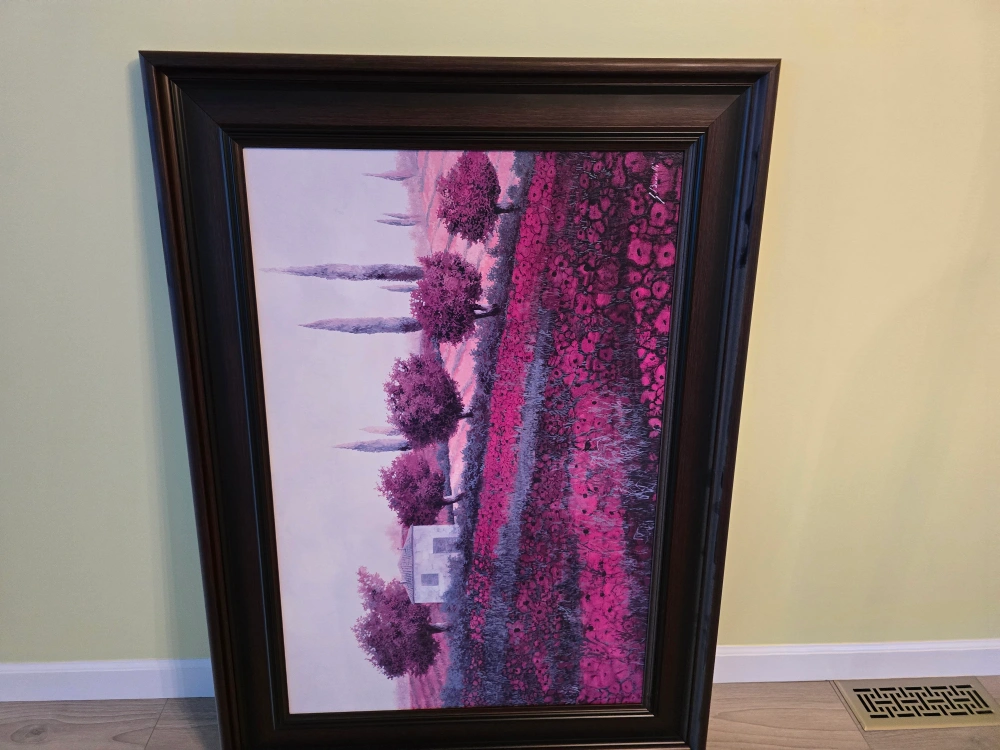 Selling two framed landscape art pieces. One features a vibrant field of pink flowers and trees, while the other captures a serene sunset over the ocean. Both pieces are in great condition and ready to add a touch of beauty to your home