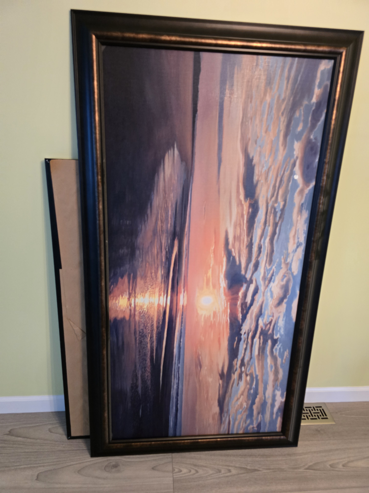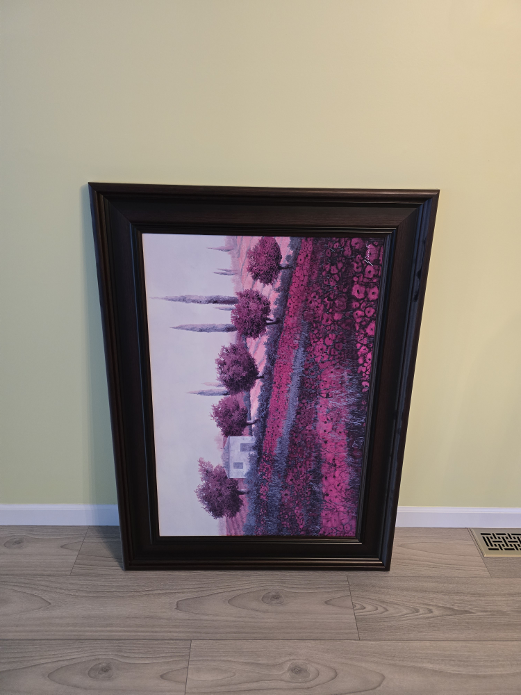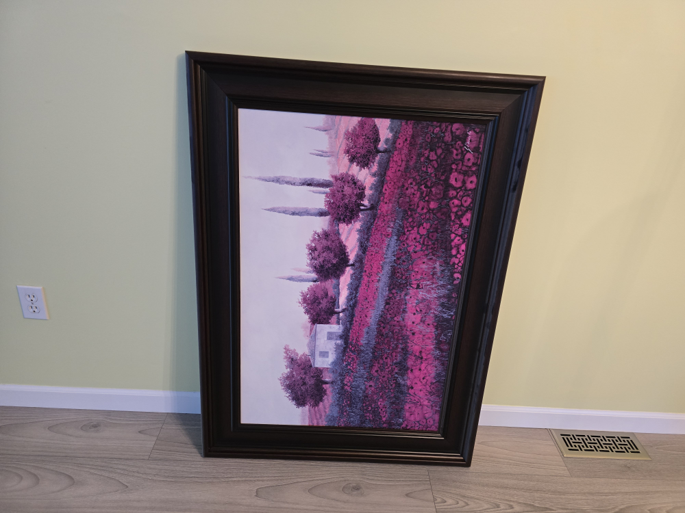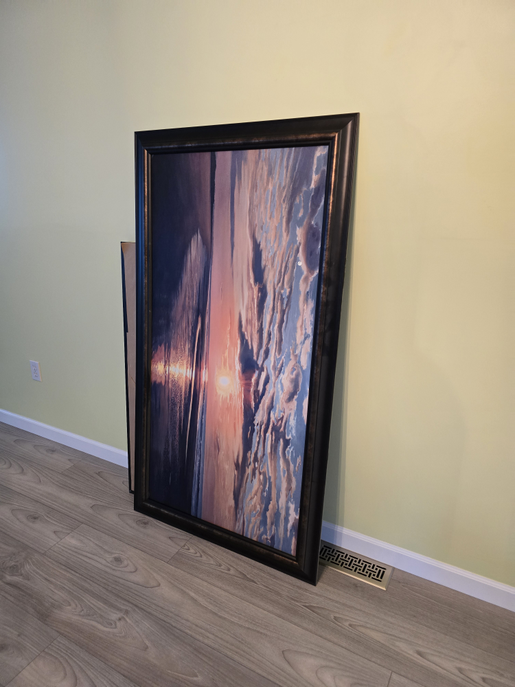 Selling two framed landscape art pieces. One features a vibrant field of pink flowers and trees, while the other captures a serene sunset over the ocean. Both pieces are in great condition and ready to add a touch of beauty to your home