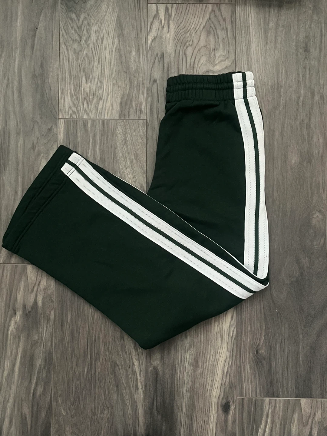Green wide leg sweatpants with white stripes on sides. Comfy-casual. No tags attached. No damage.