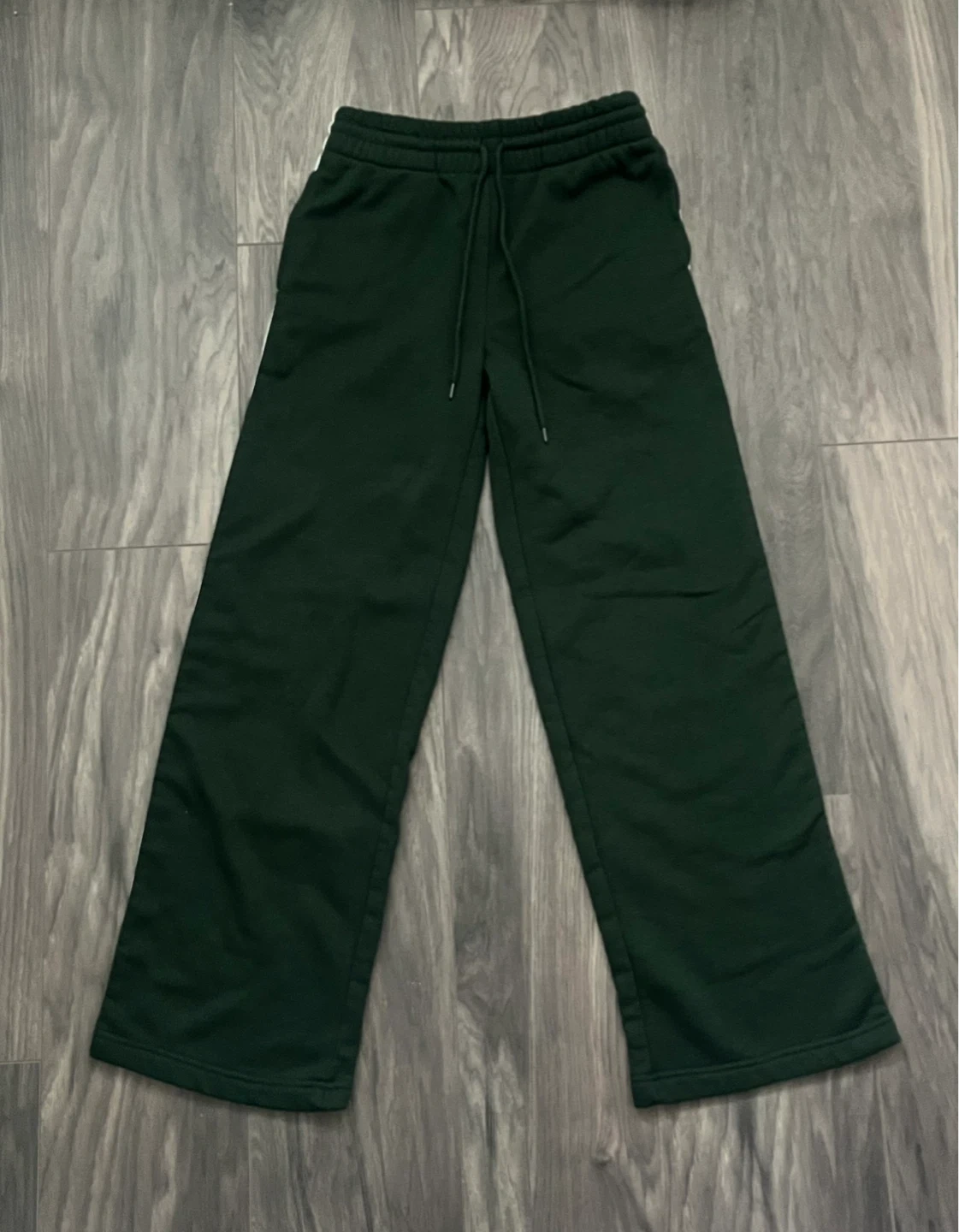 Green wide leg sweatpants with white stripes on sides. Comfy-casual. No tags attached. No damage.