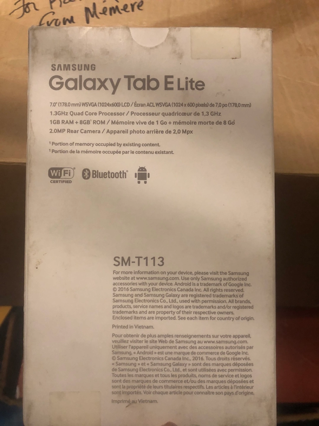 New Samsung Galaxy Tab E Lite 7-inch tablet. White. 8GB storage. Wi-Fi. Model SM-T113.