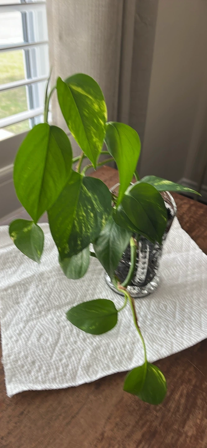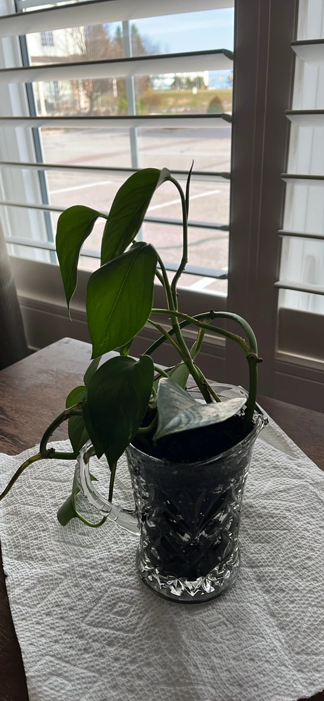 This is a Pothos plant, known for its easy care and attractive foliage. It's currently potted in a unique, textured glass holder (5 inches tall) that adds a decorative touch to any space. This plant would be a lovely addition to a home or office.