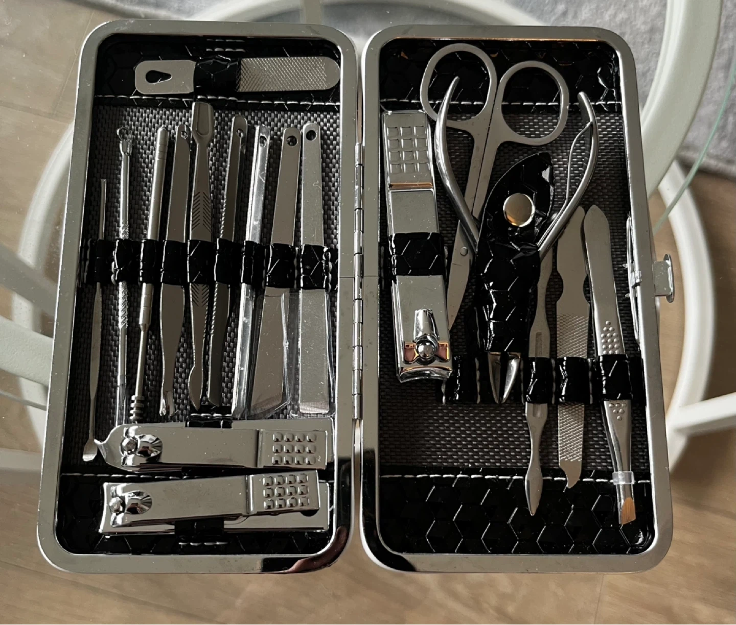 From USA 🇺🇸 A 18 piece stainless steel manicure and pedicure set. Comes in a sleek black case with a textured hexagonal pattern. Includes various tools for nail care.