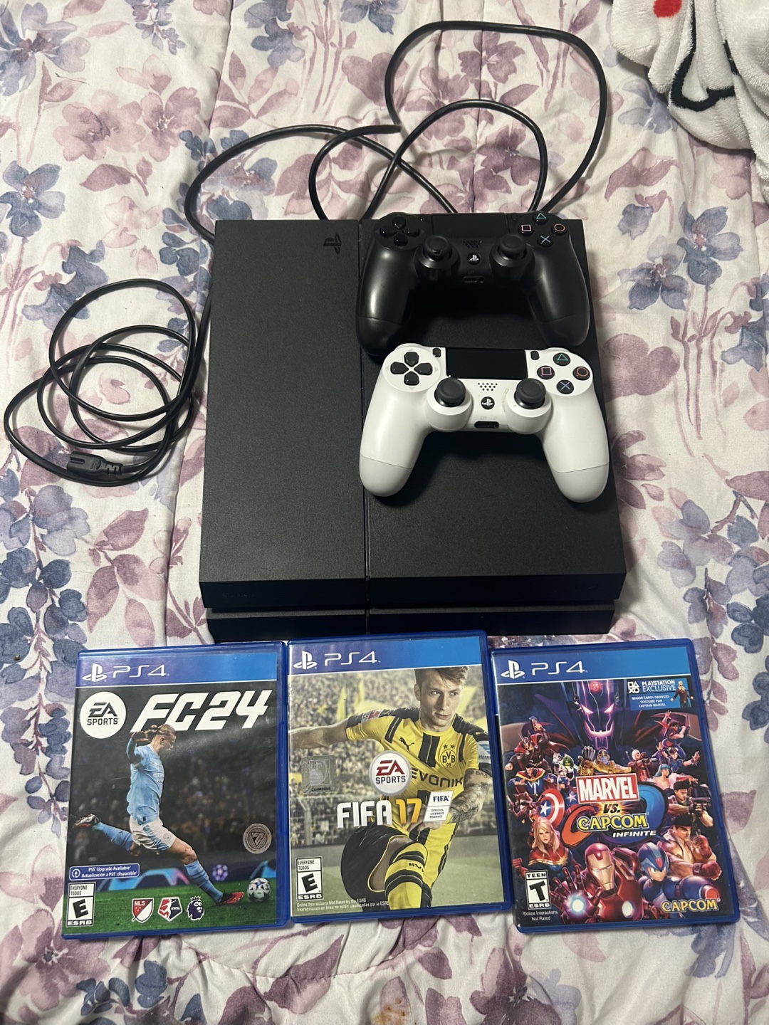 Selling a PlayStation 4 along with a controller and games! Includes two controllers, one black and one white. Also included are the games FC24, FIFA 17, and Marvel vs Capcom Infinite