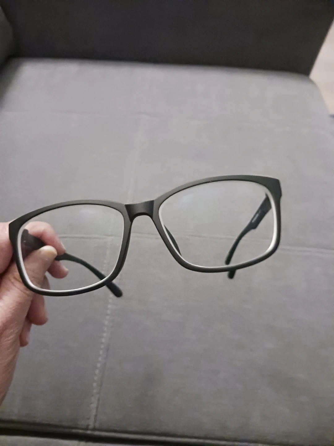These eyeglasses feature a matte black frame with a silver accent around the lenses. They're designed for a modern look. Frame material is durable plastic.