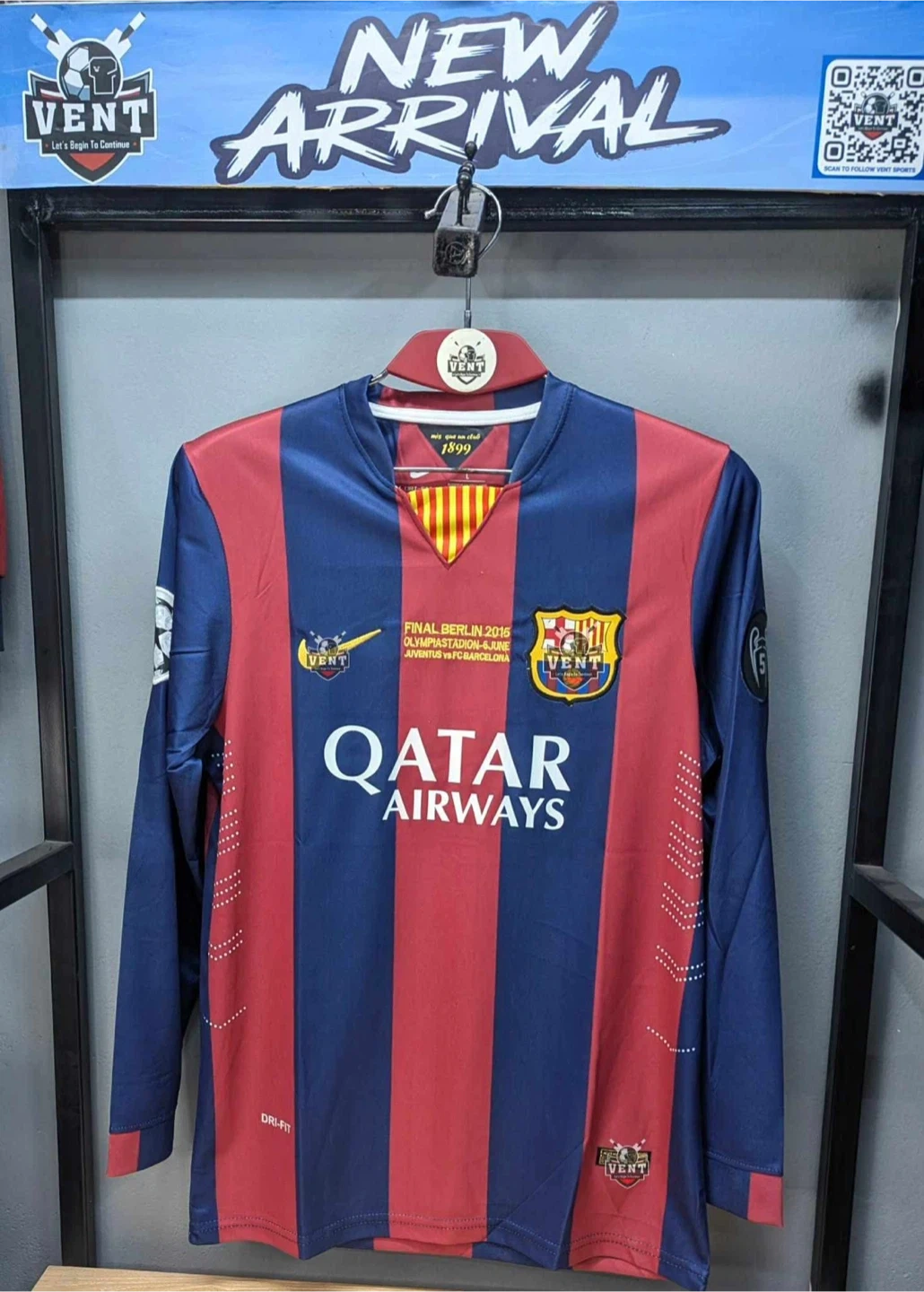 This is an FC Barcelona long sleeve jersey commemorating the 2015 Final Berlin match. It features the Qatar Airways sponsor. Dri-FIT material.