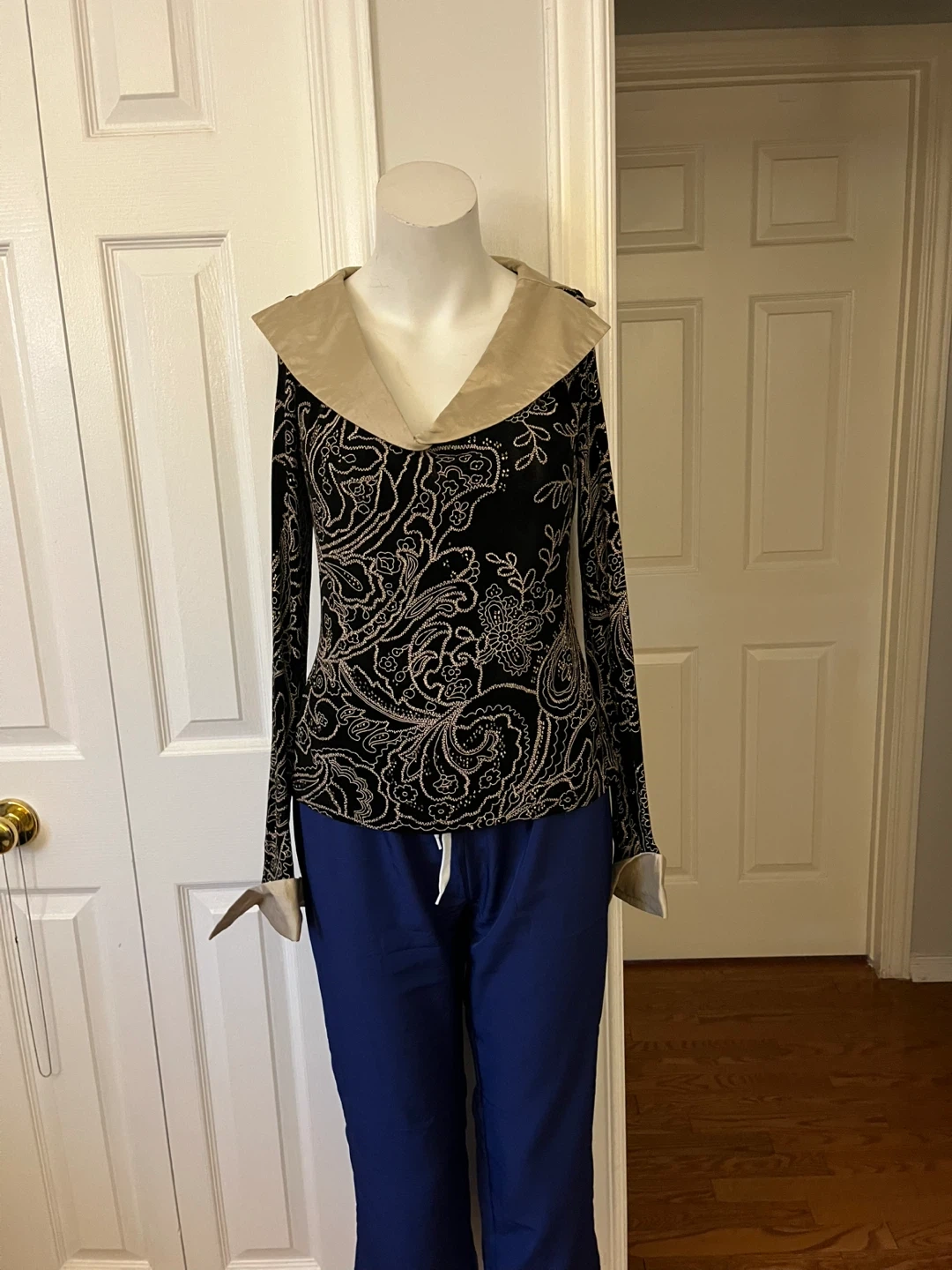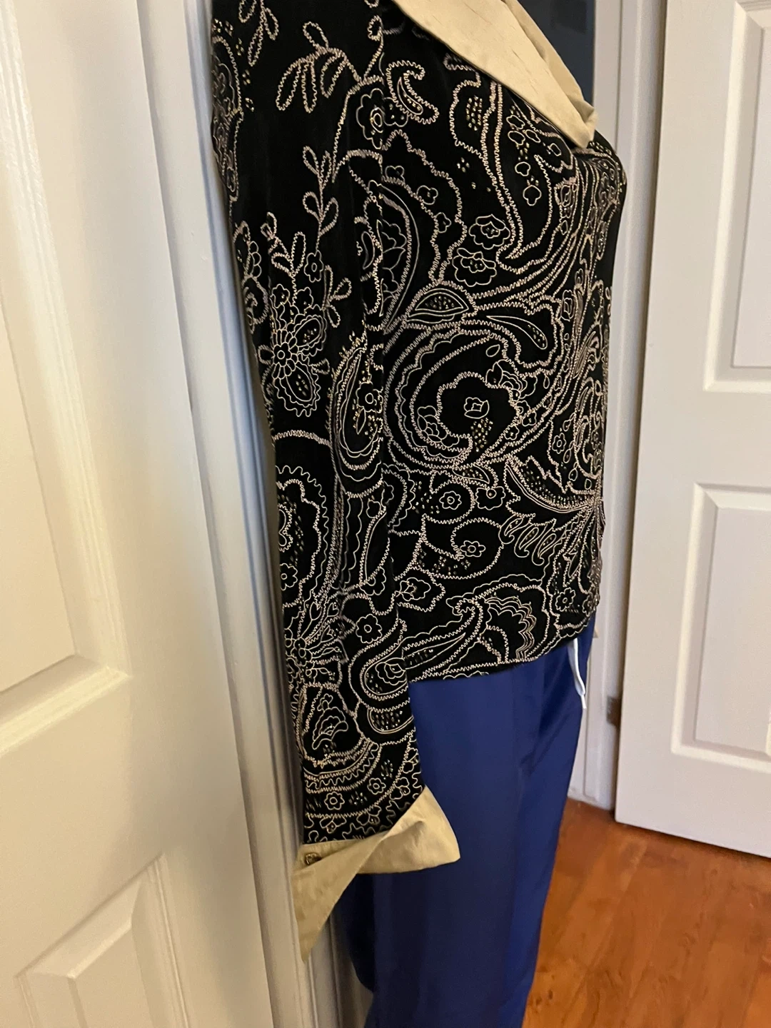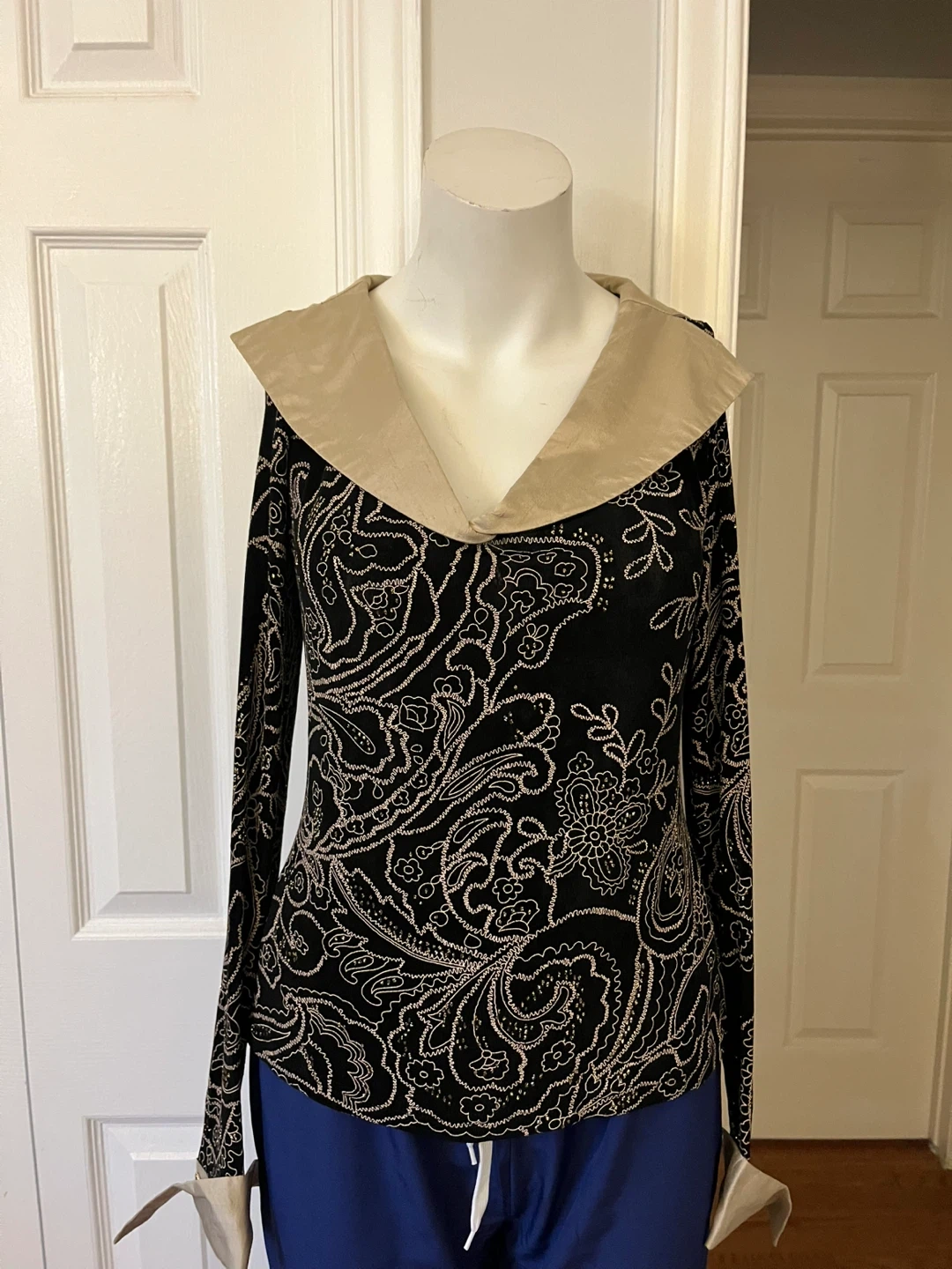 Joseph Ribkoff Trends long-sleeved top with a black and beige paisley print. Features a unique fold-over collar. Made in Canada. 96% polyester, 4% spandex. Lining is 100% polyester.