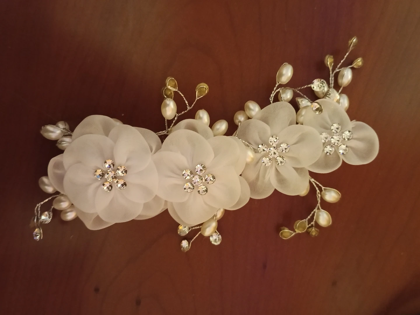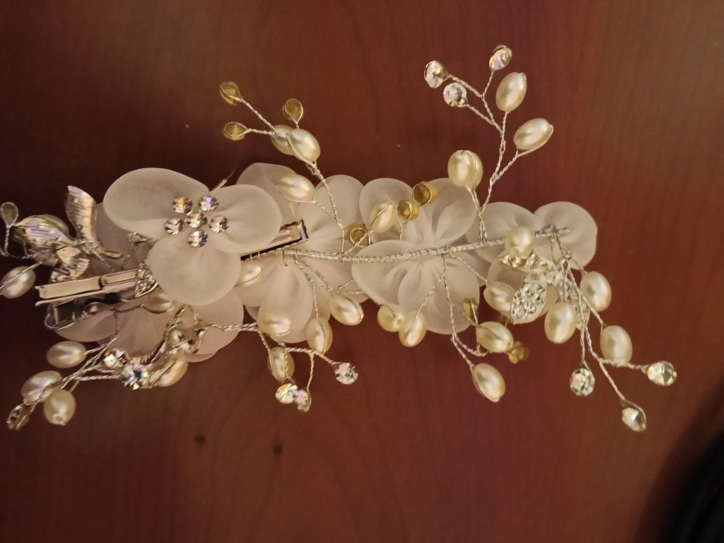 This decorative hair clip features delicate white fabric flowers adorned with sparkling rhinestones. It's embellished with faux pearls and intricate wirework branches. Secured with a silver-tone clip on the back.